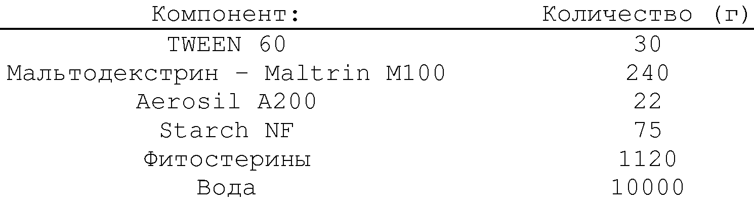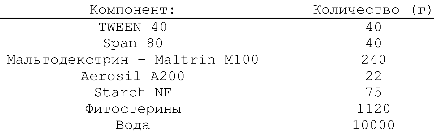 Образец получают следующим образом: к TWEEN 60 добавляют 500 г воды и смесь перемешивают на нагревательной плитке при 60°С до получения однородной смеси. Раствор переносят в контейнер большего размера, промывая водой. Добавляют дополнительные остальные 9500 г воды. Крахмал, Maltrin M100, Aerosil 200 и стерины взвешивают и добавляют к раствору. Полученный раствор перемешивают мешалкой с большими сдвиговыми усилиями в течение приблизительно 1 часа. Сразу после этого суспензию сушат распылением.