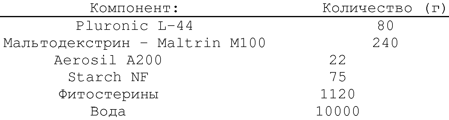 Образец получают следующим образом: Pluronic L-44 взвешивают в химическом стакане, добавляют 500 г воды и смесь перемешивают на нагревательной плитке при 60°С до получения однородной смеси. Раствор переносят в большой контейнер, промывая водой. Добавляют остальные 9500 г воды. Крахмал, Maltrin М100, Aerosil 200 и стерины взвешивают и добавляют к раствору. Полученный раствор перемешивают с помощью мешалки с большими сдвиговыми усилиями в течение приблизительно 1 часа. Сразу после этого суспензию сушат распылением.