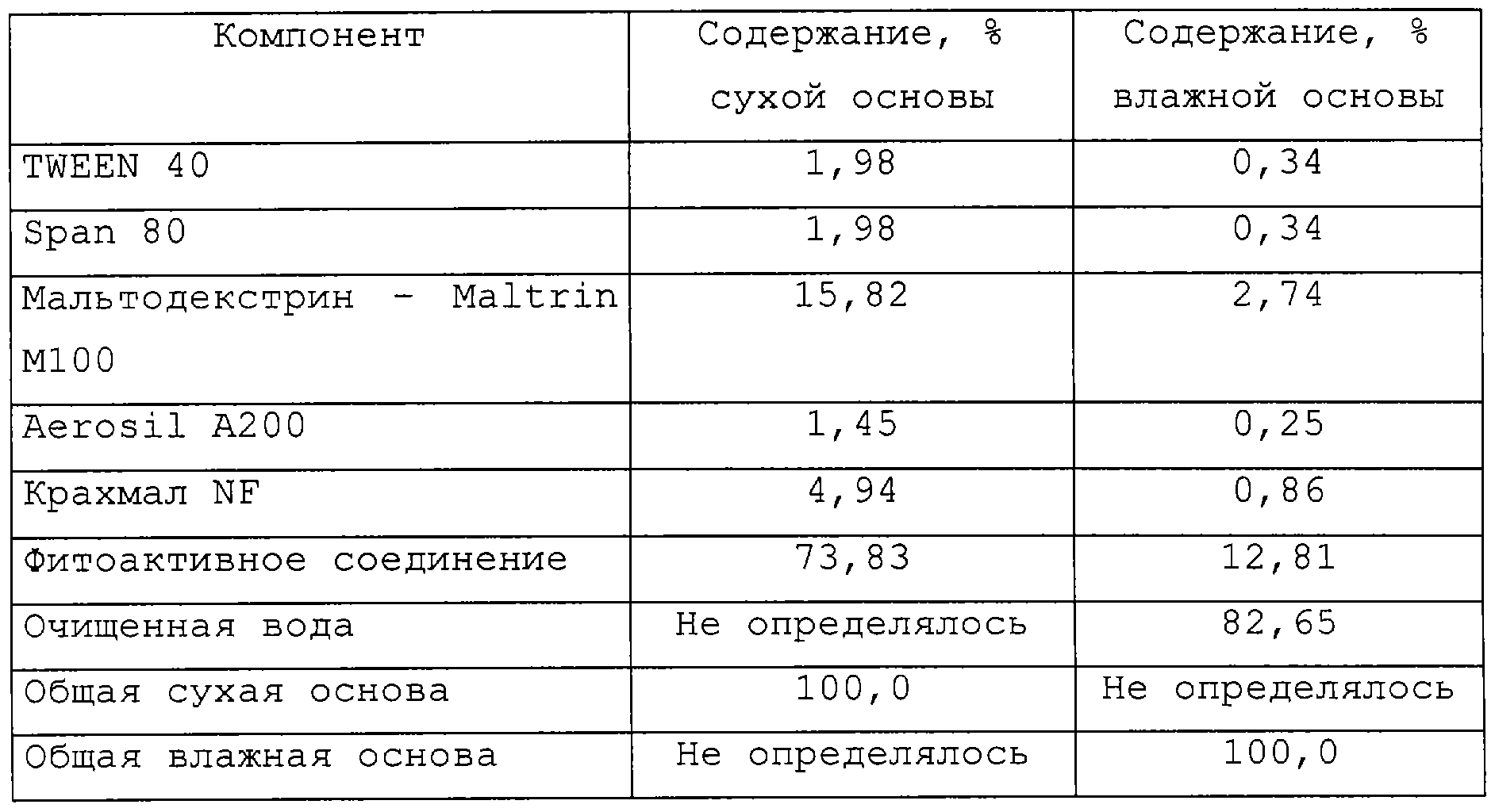 Три отдельных опыта сушки распылением выполняют, используя 3 различных фитоактивных соединения. Фитоактивными соединениями являются