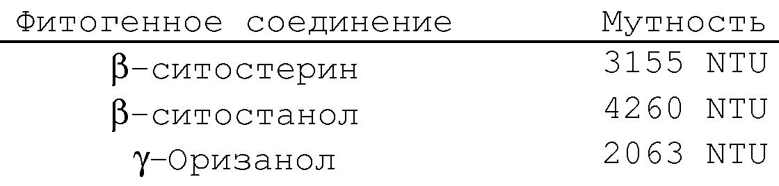 -Ситостерин и другие ингредиенты в суспензии должны быть однородно смешаны. Предпочтительно суспензию смешивают посредством перемешивания, предпочтительно при использовании высокоскоростного смесителя. Размер частиц мицелл в образованной суспензии составляет от приблизительно 50 до приблизительно 400 микрон, предпочтительно от приблизительно 100 до приблизительно 300 микрон и наиболее предпочтительно от приблизительно 150 до приблизительно 250 микрон. Размер мицелл, образованных в суспензии, может быть измерен с использованием турбидиметра. При более высокой мутности образуются более крупные мицеллы. Ожидается, что более высокая мутность, то есть более крупные мицеллы, обеспечивает более эффективную форму -ситостерина для снижения содержания холестерина при употреблении. Предпочтительные уровни мутности составляют более чем приблизительно 2000, предпочтительно более чем 2500 и наиболее предпочтительно более чем 3000 Нефиаловых Единиц Мутности (Nepthialic Turbidity Units – NTU). В данном описании термин “мутность” используется как определено Фармакопеей США (United States Pharmacopeia) , эффект рассеяния света суспендированных частиц и мутность как мера снижения интенсивности падающего луча на единицу длины данной суспензии. Область значений мутности составляет от 0 до 20000 NTU. В качестве точки отсчета мутности используется мутность воды, равная 0. Мутность образцов измеряли при комнатной температуре.