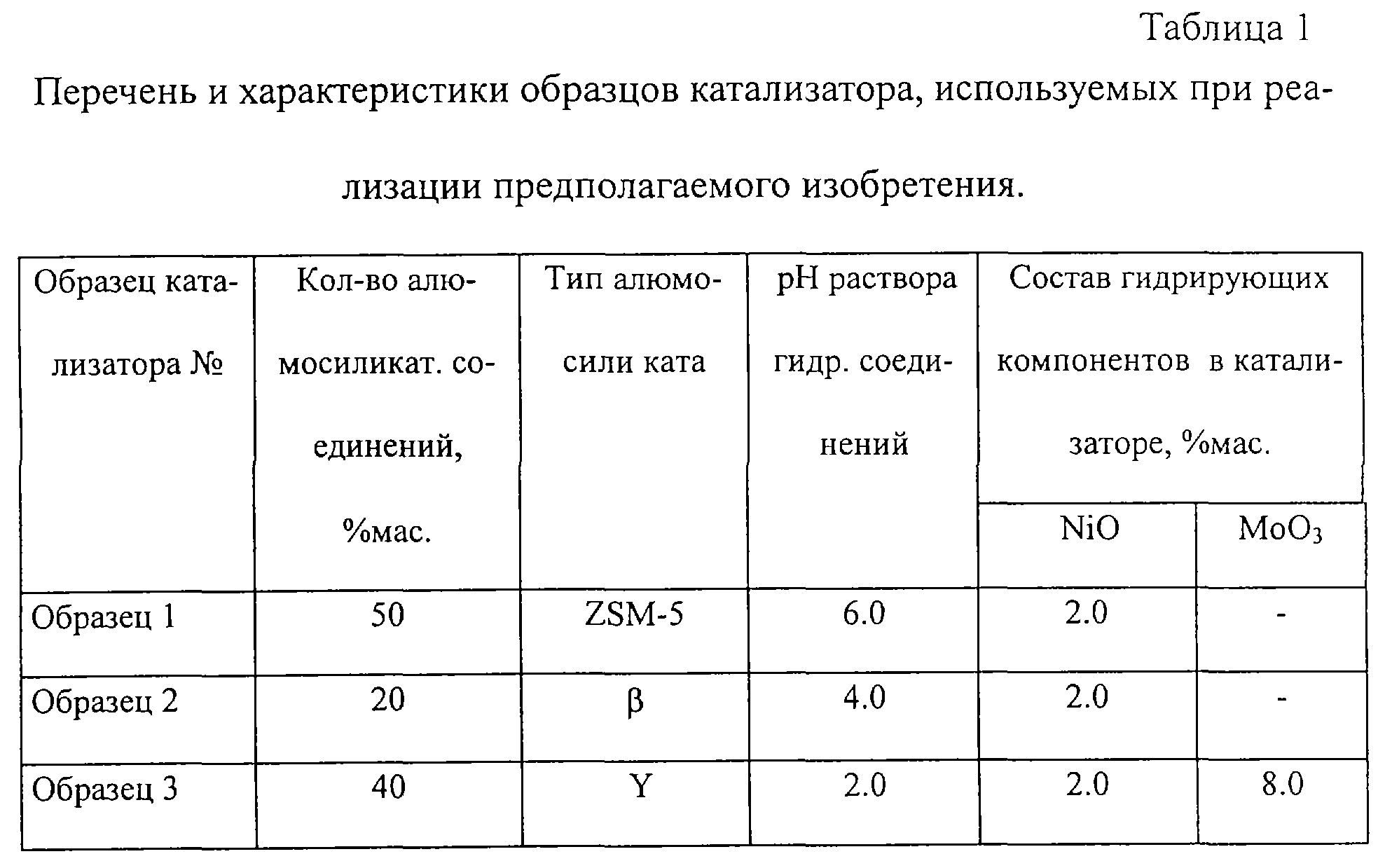 При проведении испытаний предложенного технического решения в качестве катализатора использованы образцы, полученные в соответствии со способом получения катализатора по материалам патента РФ №2183505, приор. от 16.01.2002 (см. табл.1).