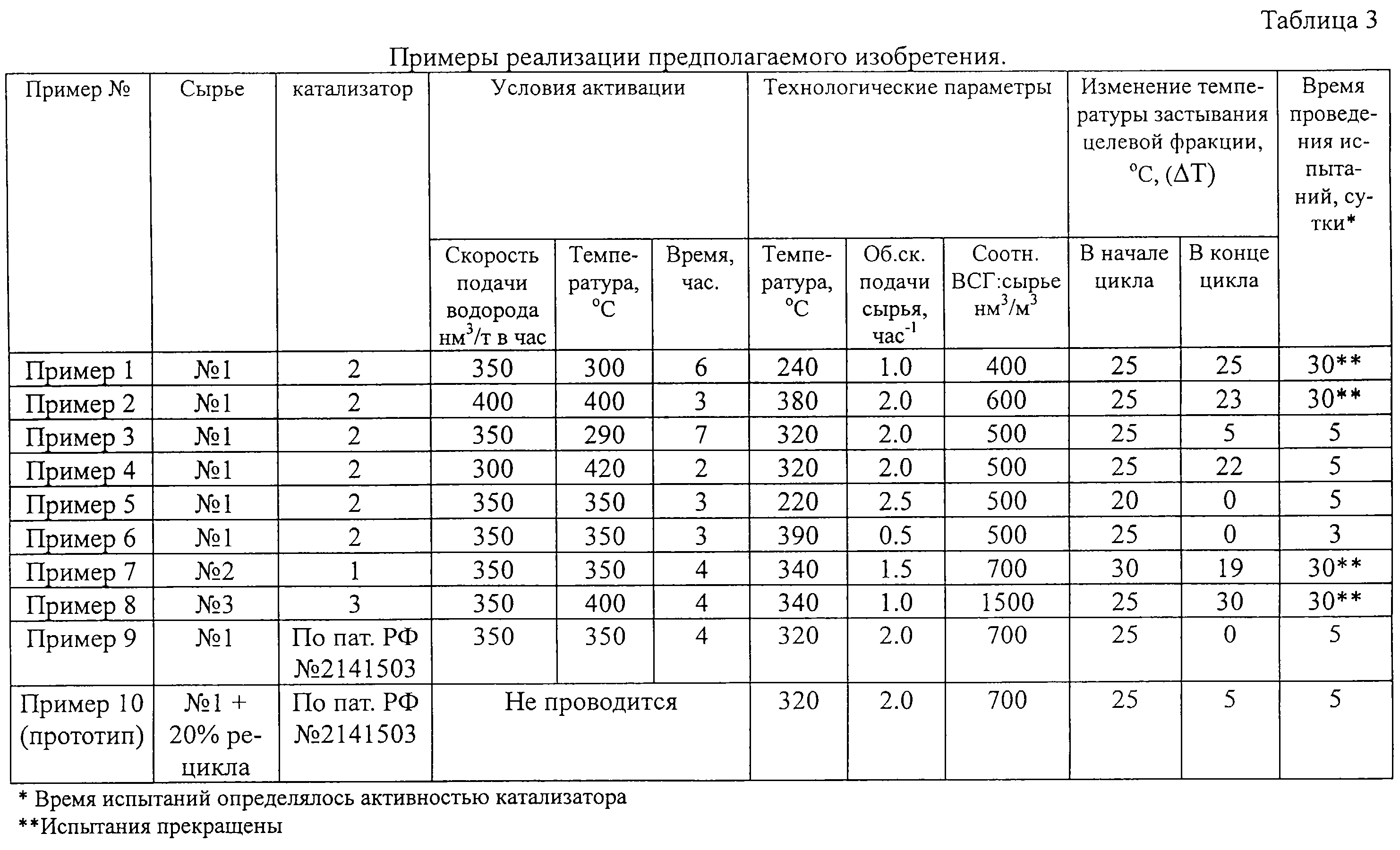 Видно, что примеры, выполненные в соответствии с формулой предлагаемого изобретения (примеры 1, 2, 6, 7) превосходят результаты испытаний, выполненных по условиям прототипа (пример 10) даже при высоком соотношении ВСГ:сырье (700 нм3/м3). В начальный момент эксплуатации во всех рассматриваемых примерах изменение температуры застывания целевой фракции (ДТ) высокое и составляет 25-30