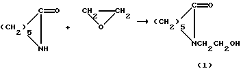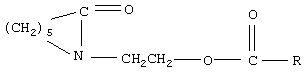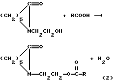 1 стадию – оксиэтилирование капролактама осуществляют по методике (Японск. пат. 26176, 11.11.68) с использованием эквимолярных количеств исходных продуктов путем барботирования окиси этилена через расплав капролактама при температуре 125-140oС, под давлением 3 атм или без него, в присутствии КОН в качестве катализатора в количестве 0,01-0,1 мас.% в расчете на капролактам по реакции:![]() II стадию – получение сложного эфира N-оксиэтиленкапролактама и синтетических жирных кислот осуществляют по методике (Б.К. Зейналов, Ф.И. Гарибов, А. Б. Насиров и др. Азерб. нефт. хоз-во, 1973, 2, с.32-33; авт. свид. СССР 292958, 17.03.71) путем нагревания эквимолярных количеств реагентов (N-оксиэтиленкапролактама и СЖК фракции 10-C16) в ксилоле при температуре 140-150oС в течение 10-18 часов. В качестве катализатора используют ионообменную смолу КЧ-2-8 чс в H+-форме в количестве 2-10 мас.% в расчете на СЖК по реакции: ![]() где R=C9H19 C15H31.