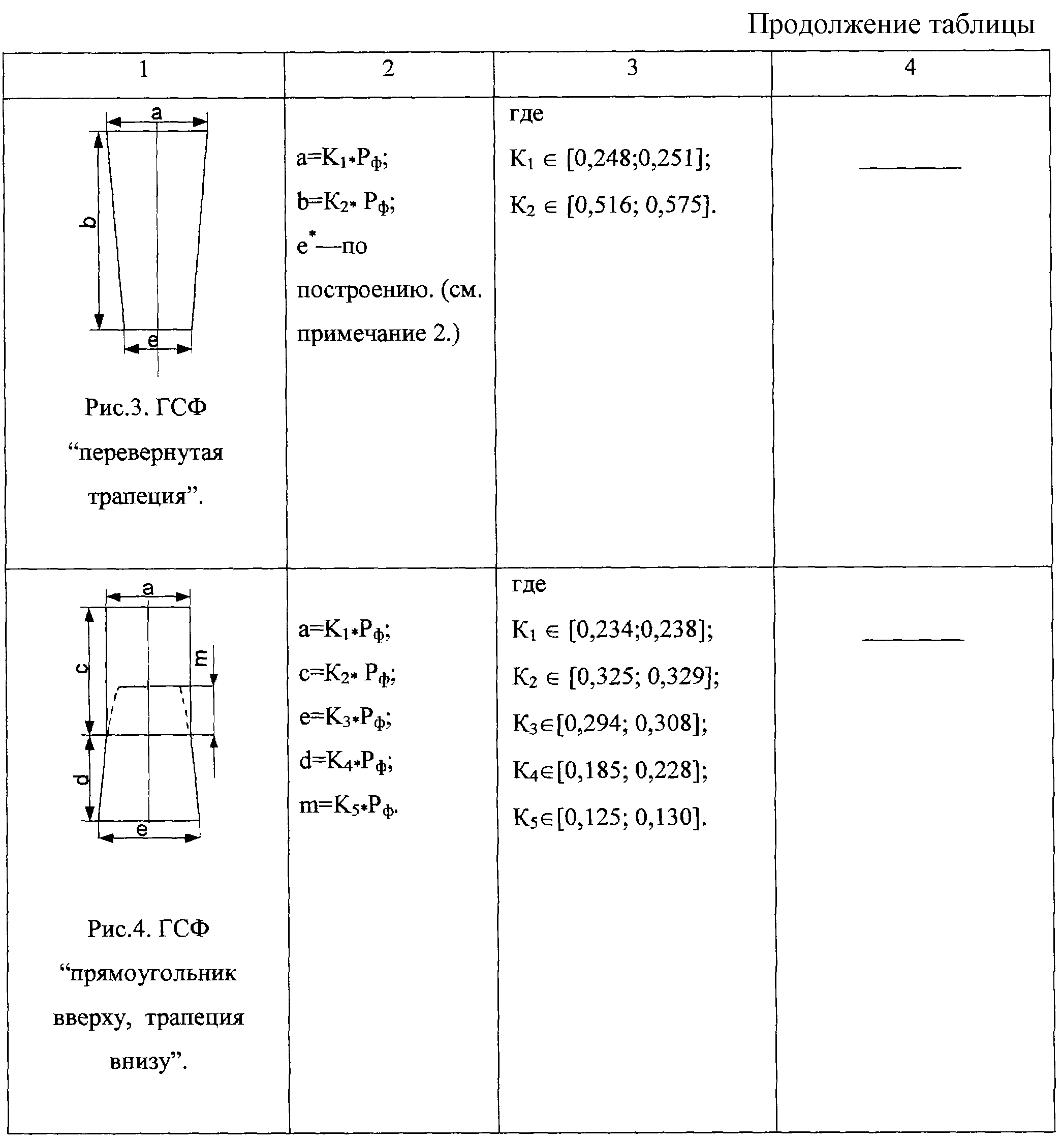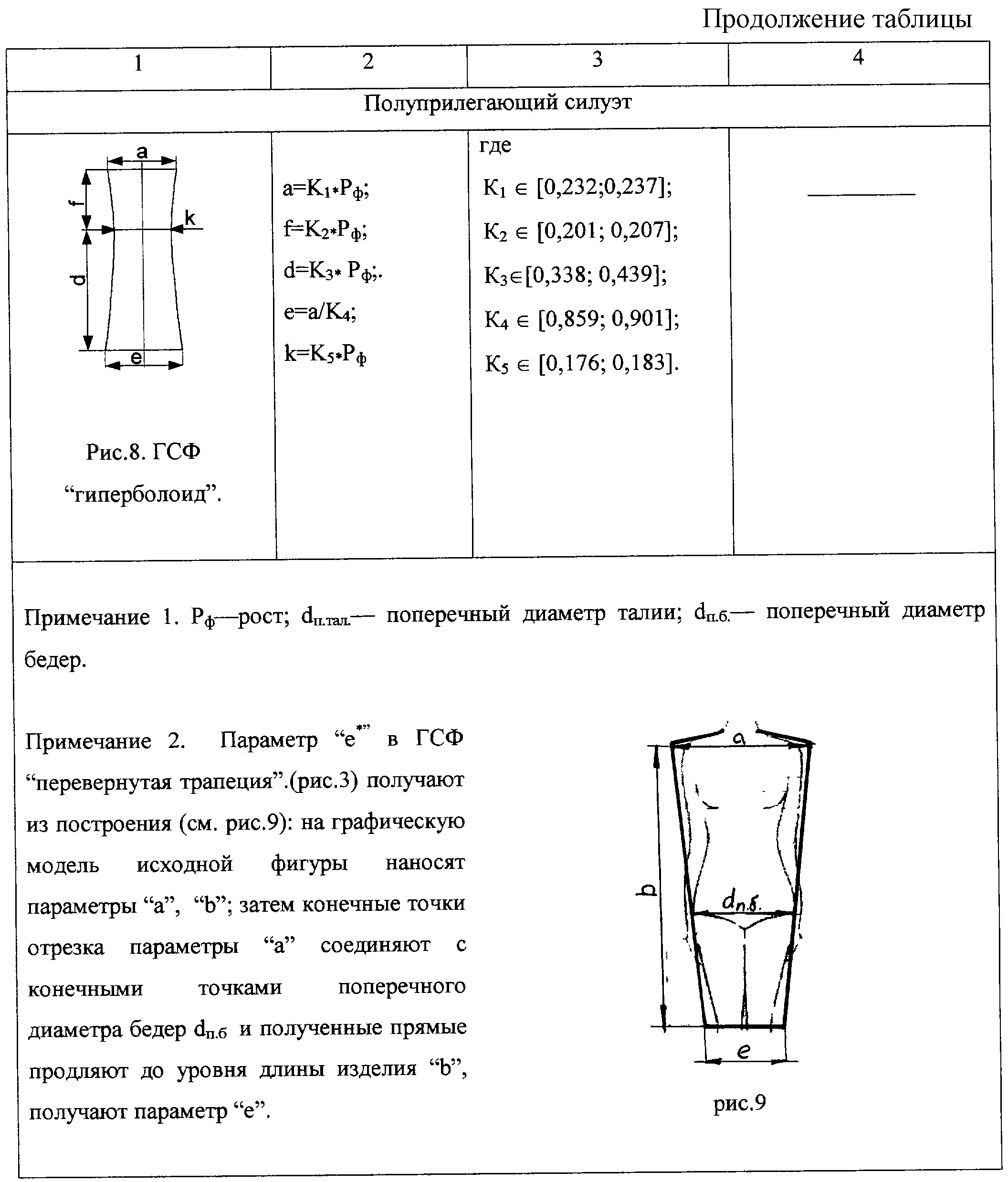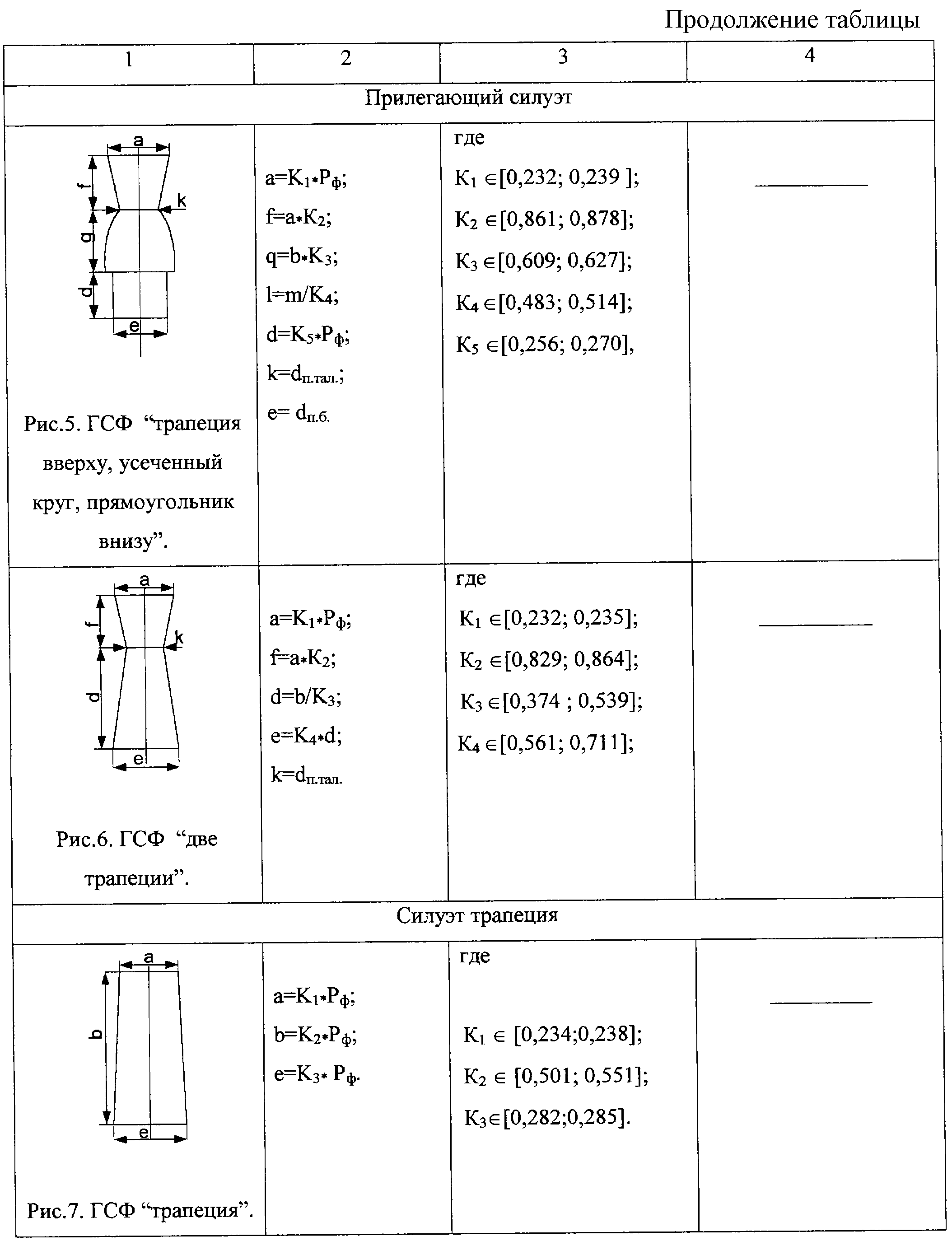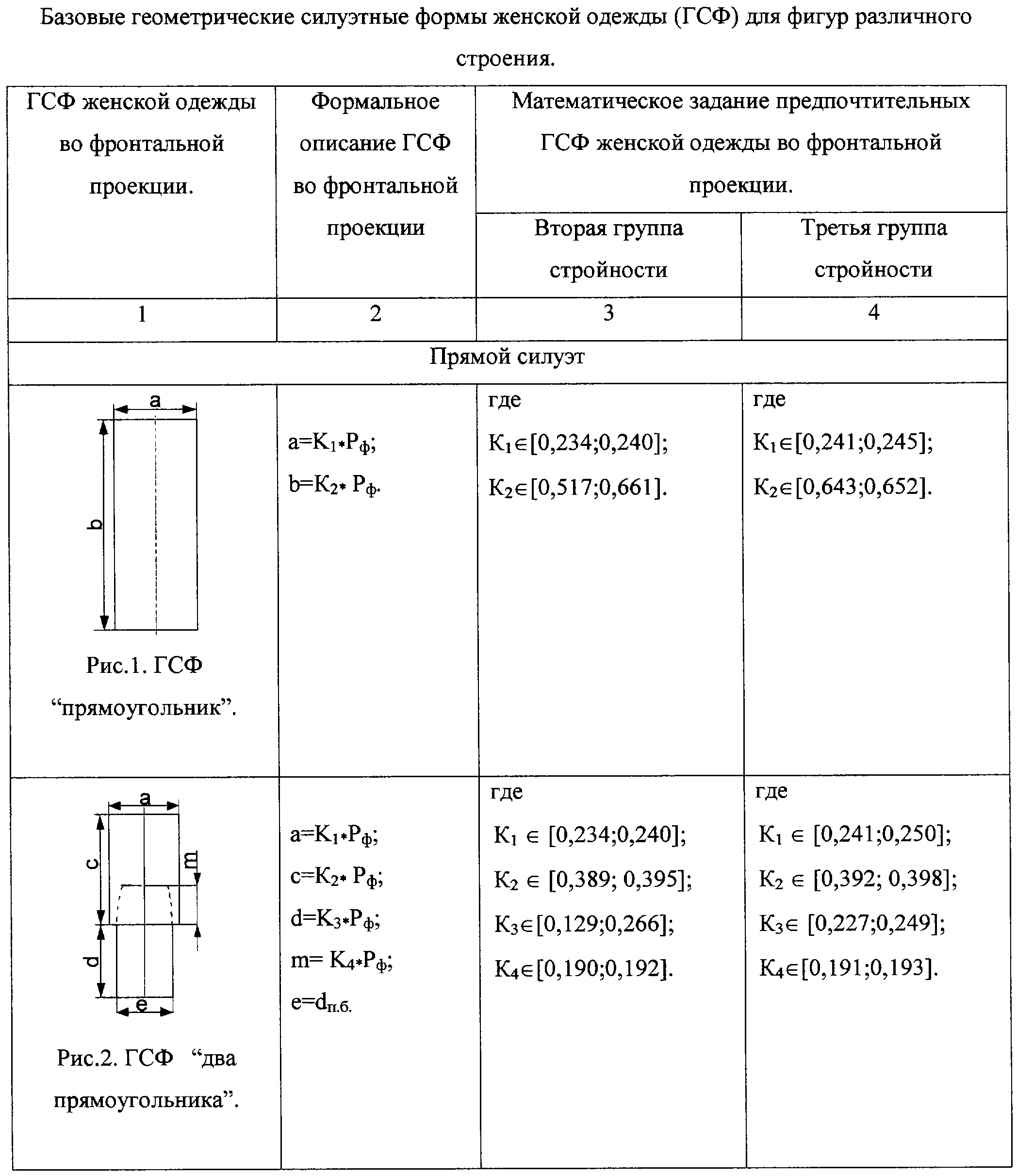 Далее осуществляют выбор предпочтительной ГСФ одежды для исходной фигуры, учитывая принадлежность ее к определенной группе стройности и направление моды, и рассчитывают параметры выбранной ГСФ. Для фигур, относящихся к первой группе стройности, подходят любые силуэты, модные варианты ГСФ одежды. Выбор предпочтительной ГСФ одежды для фигур второй и третьей групп стройности осуществляют в соответствии с матрицей базовых ГСФ одежды, представленных в форме таблицы, в которой предложено восемь базовых ГСФ одежды, имеющих наибольшую частоту встречаемости по сравнению с другими ГСФ одежды за последние 50 лет. Причем для фигур второй группы стройности выбирают любые ГСФ одежды из матрицы базовых ГСФ одежды. Для фигур третьей группы стройности из матрицы базовых ГСФ одежды выбирают ГСФ одежды №1 и №2 прямого силуэта. Определение значений параметров выбранной предпочтительной ГСФ одежды производят по формуле