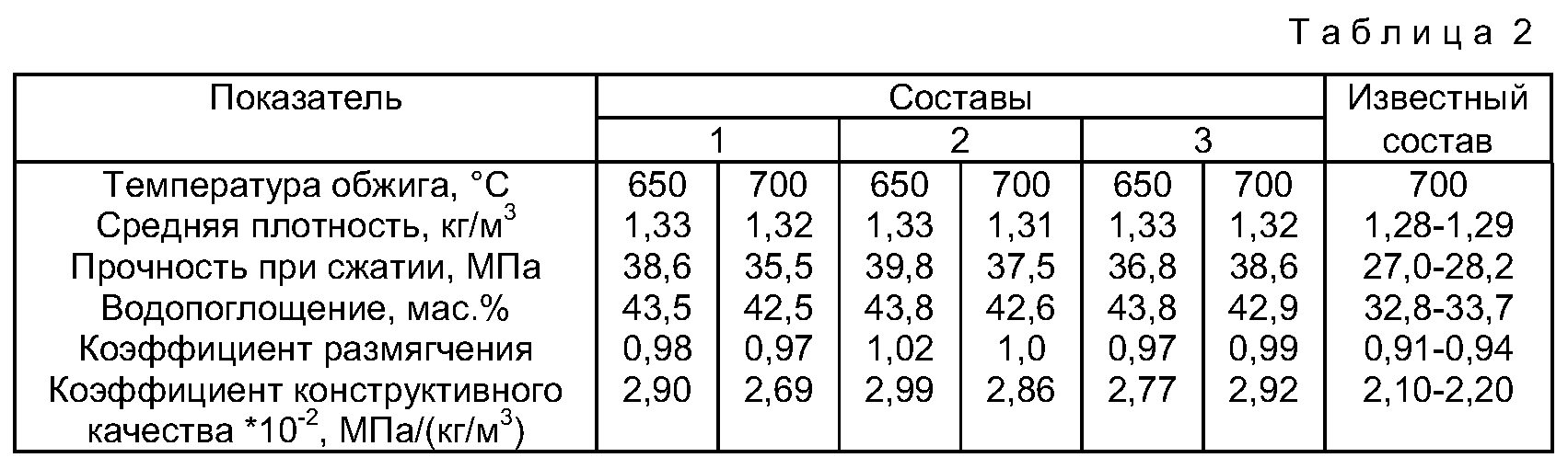 * коэффициент конструктивного качества рассчитан как отношение прочности (МПа) к средней плотности (кг/м3), а коэффициент размягчения – как отношение прочности влажных образцов (после нахождения в воде в течение 2 суток) к прочности сухих обожженных изделий.