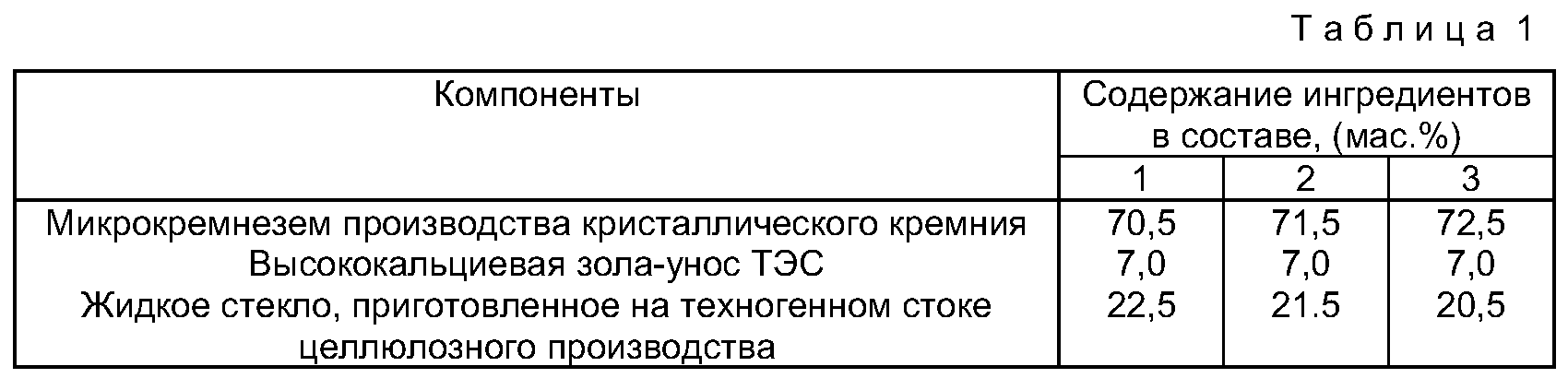Формула изобретения Сырьевая смесь для изготовления стеновых материалов, включающая микрокремнезем, жидкое стекло и добавку, отличающаяся тем, что в качестве добавки она содержит высококальциевую золу-унос ТЭС при следующем соотношении компонентов, мас. %: Микрокремнезем производства кристаллического кремния 70,5 – 72,5 Жидкое стекло 20,5 – 22,5 Высококальциевая зола-унос ТЭС 7,0 MM4A Досрочное прекращение действия патента Российской Федерации на изобретение из-за неуплаты в установленный срок пошлины за поддержание патента в силе