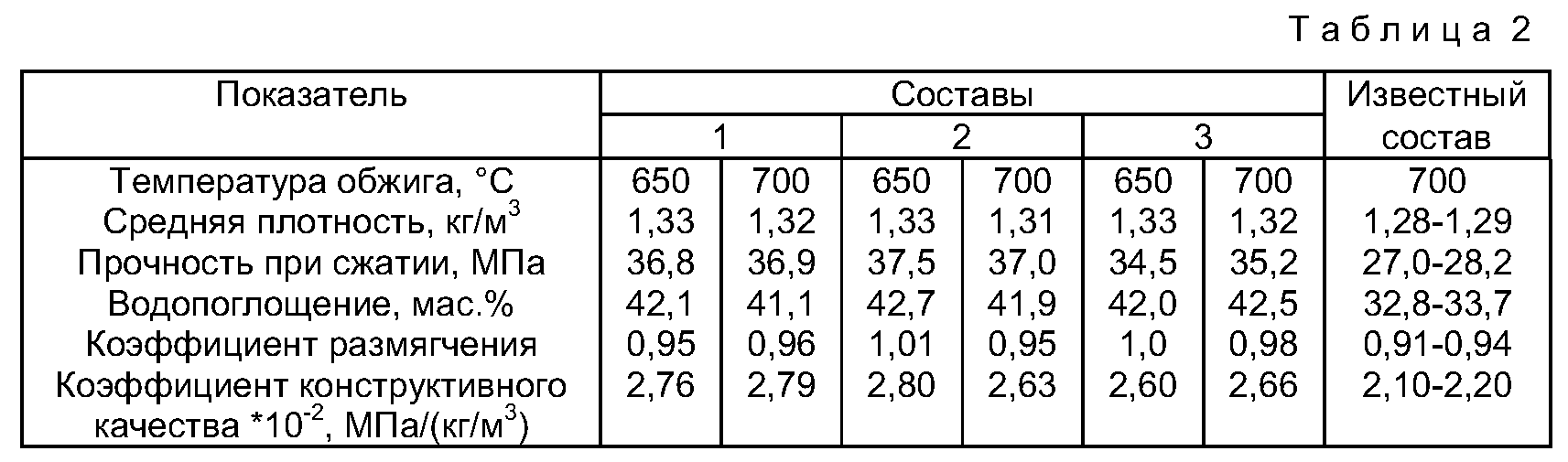 Примечание: коэффициент конструктивного качества рассчитан как отношение прочности (МПа) к средней плотности (кг/м3), а коэффициент размягчения – как отношение прочности влажных образцов (после нахождения в воде в течение 2 суток) к прочности сухих обожженных изделий.