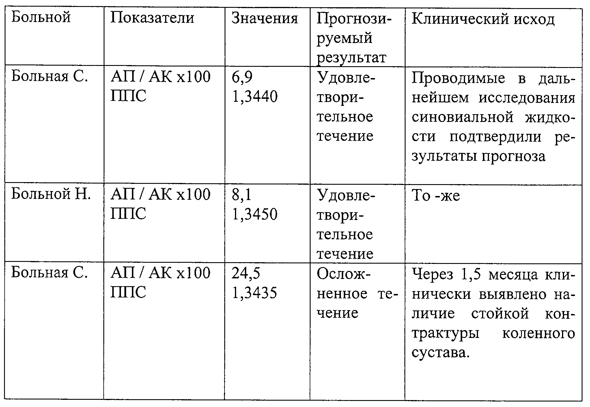 Способ осуществляют следующим образом. У больного на 7-10 сутки после травмы на фоне проводимого консервативного лечения гемартроза натощак забирают кровь из вены, стандартным способом получают сыворотку крови, в которой определяют активность ферментов пероксидазы и каталазы (Тиц Н. Энциклопедия клинических лабораторных тестов. – М.: Лабинформ, 1997; Методы исследования в профпатологии./ Под ред. О.Г. Архиповой. – М.: Медицина, 1988). Рассчитывают их соотношение: АП/АК х 100.