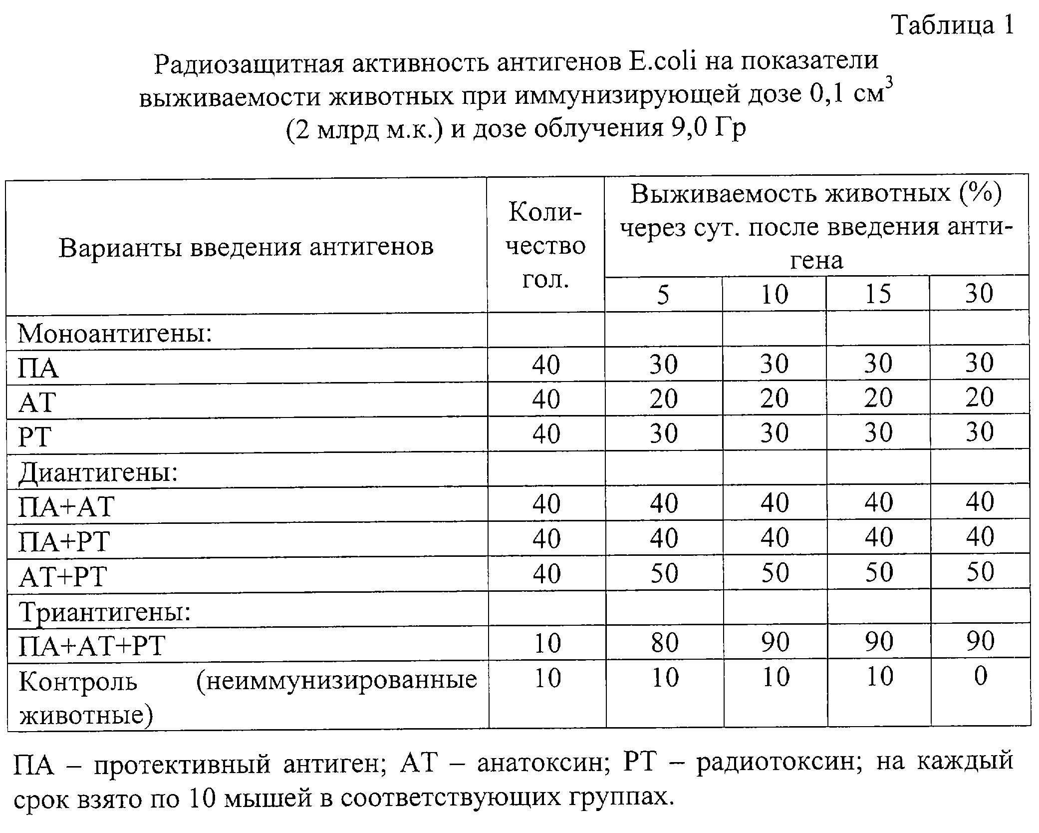 Результаты определения радиозащитной активности антигенов в отдельности и в сочетании представлены в табл. 1.