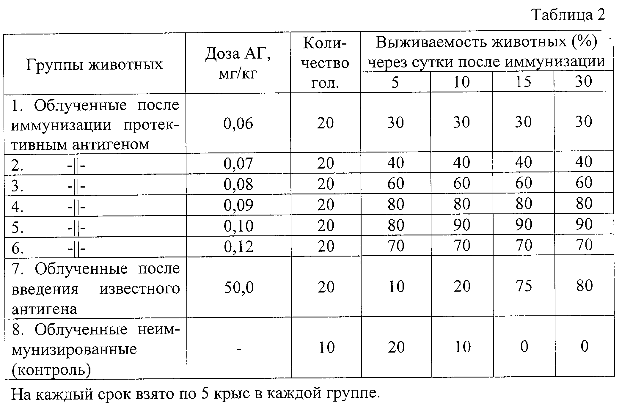 Пример 5. В опытах на белых крысах устанавливали оптимальную дозу антигенного комплекса, используя для этой цели 150 животных живой массой 150-180 г, разделенных на 8 групп. Животных первых 6 групп подкожно однократно иммунизировали тривакциной (ПА+АТ+РТ), 7-ой группы – известной вакциной (контроль вакцины), 8-ой – не иммунизировали (контроль облучения). Оценку радиозащитной активности препаратов проводили согласно примеру 4.