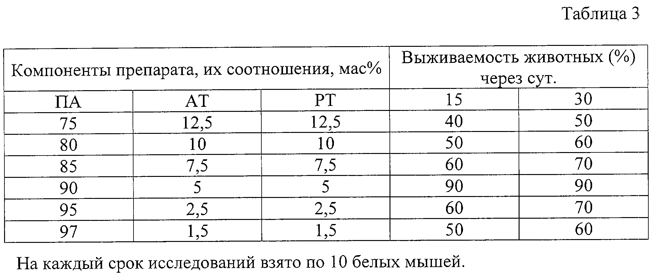Пример 6. Опыты по изучению оптимального соотношения компонентов-антигенов тривакцины проводили на 120 белых мышах живой массой 18-20 г, разделенных на 6 групп по 20 мышей в каждой, которым за 5 и 15 дней до летального облучения (8,5 Гр) вводили предлагаемый радиозащитный препарат в оптимальной иммунизирующей дозе (0,95 мг/кг) при различных объемных соотношениях компонентов тривакцины. Оценку эффективности препаратов проводили согласно примеру 4. Результаты опытов представлены в табл. 3.