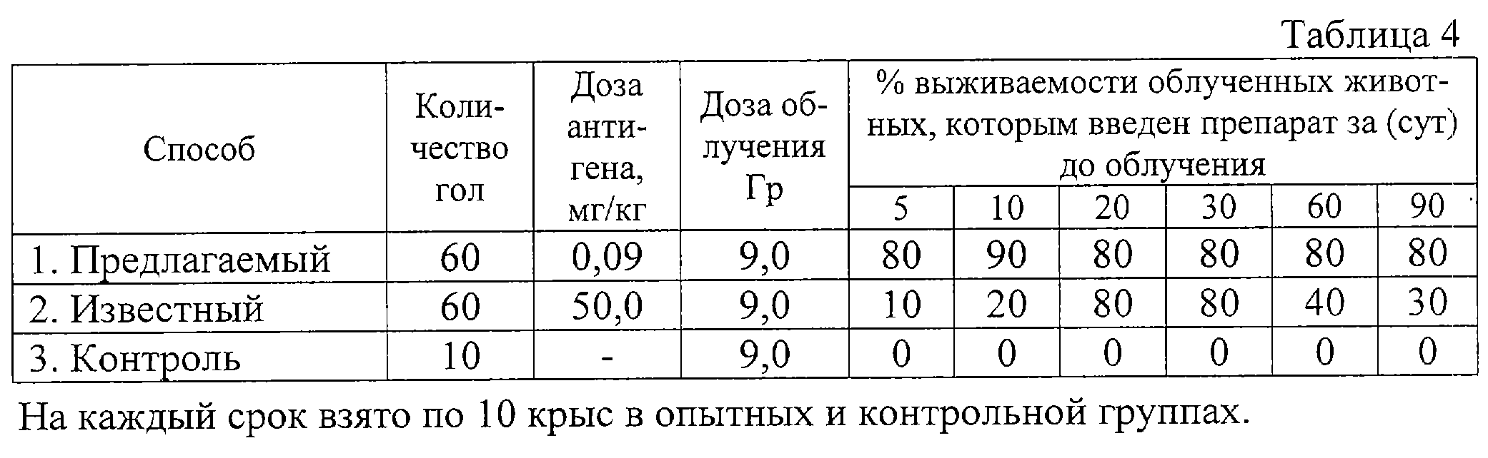 Пример 7. Сроки наступления радиорезистентности и ее продолжительность проверены на 130 белых крысах, иммунизированных за 5, 10, 20, 30, 60 и 90 дней до летального облучения (9,0 Гр). Для сравнения параллельно проводили опыты с использованием известного способа. Результаты сравнительных опытов представлены в табл. 4.