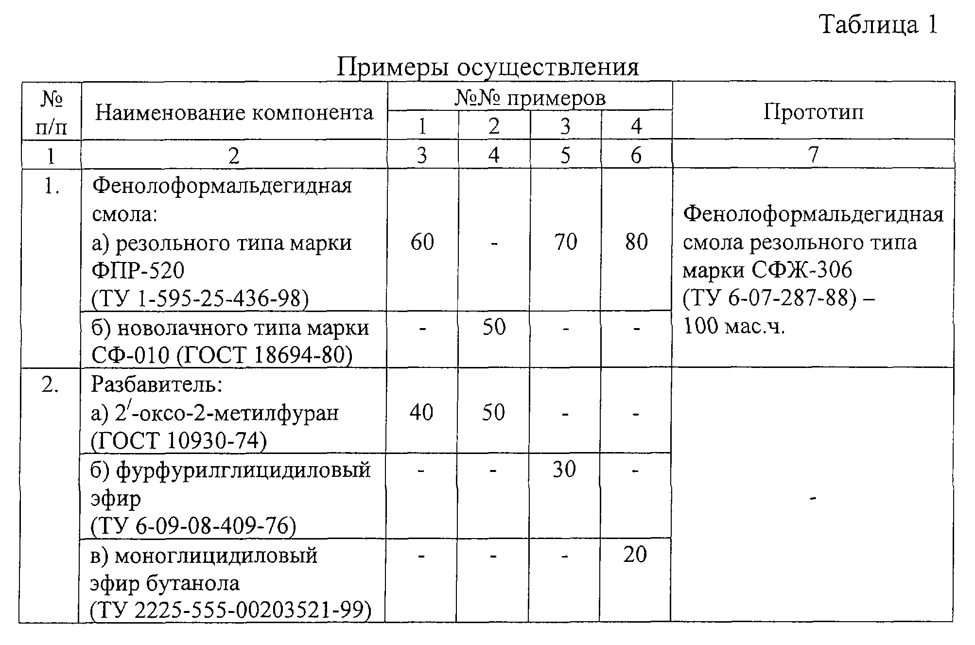 Применение в качестве активного разбавителя 2’-оксо-2-метилфypaна или низковязких моноглицидиловых эфиров позволяет, с одной стороны, существенно снизить вязкость фенолоформальдегидного связующего, что, в свою очередь, дает возможность ввести в композицию достаточно большое количество наполнителей и, с другой стороны, вступать в химическое взаимодействие по функциональным группам