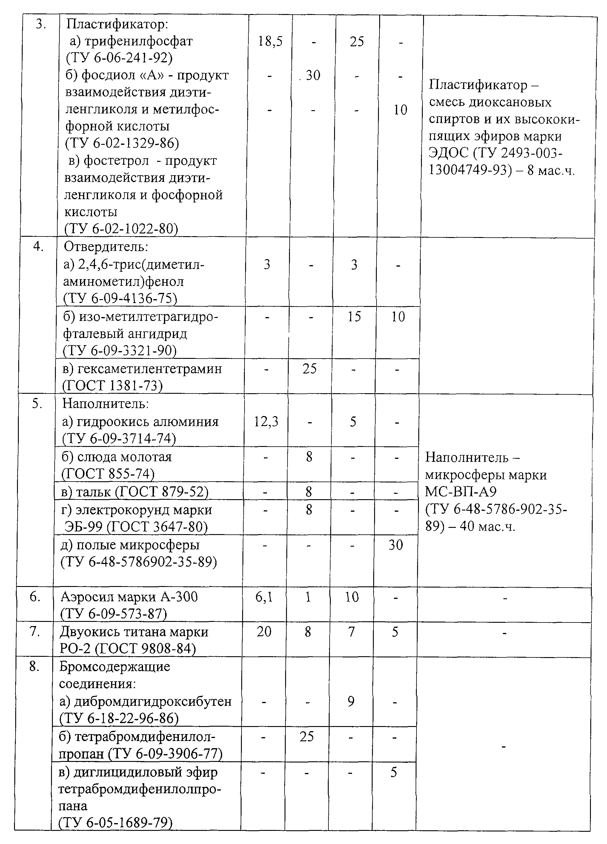 В качестве наполнителя используют гидроокись алюминия, электрокорунд, тальк, слюду, микросферы. В случае применения заявляемой композиции для крупногабаритных листовых материалов в состав дополнительно вводят бромсодержащие соединения в количестве 5-25 мас.ч.
