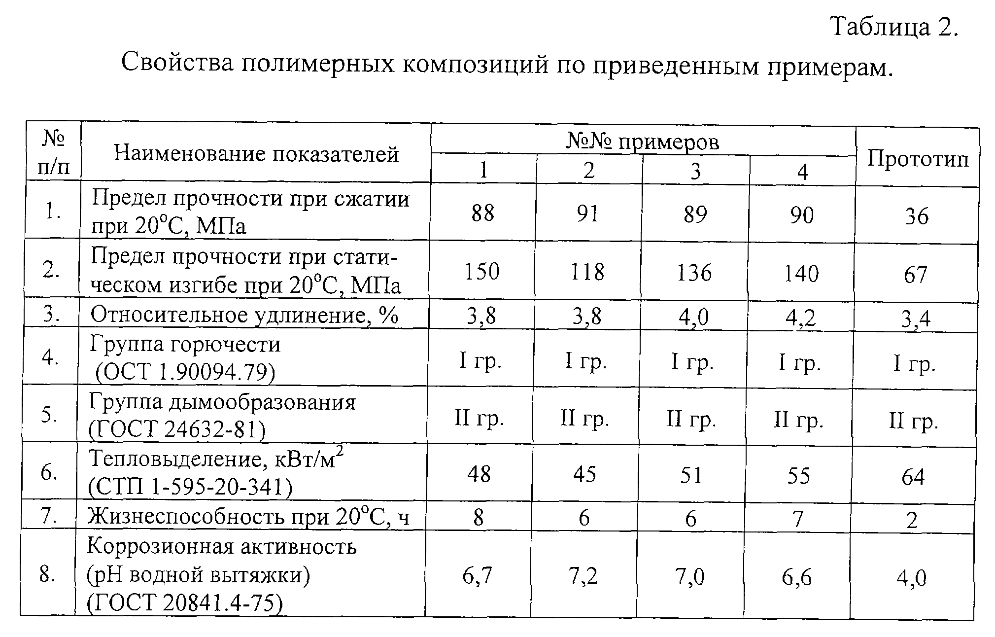 Из приведенной табл. 2 следует, что полимерная композиция предлагаемого состава обладает жизнеспособностью в 3-4 раза выше прототипа, прочностью при сжатии и статическом изгибе в 2 раза выше, чем у прототипа, и значительно меньшим показателем тепловыделения, что чрезвычайно важно для материалов интерьера пассажирских самолетов. Кроме того, предлагаемая композиция является нейтральной (рН водной вытяжки составляет от 6,6 до 7,2 ед.) по отношению к прототипу, величина рН которой составляет 4 ед., т.е. дает кислую реакцию.