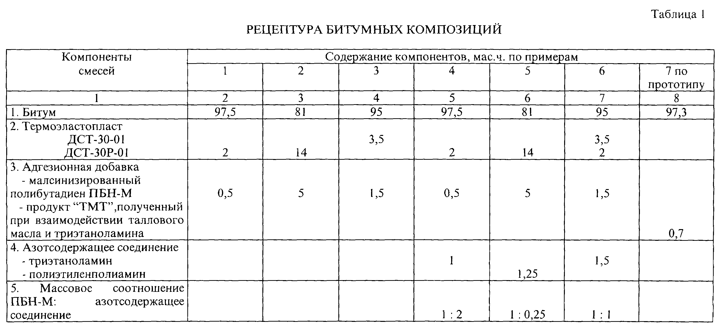 Пример 6. Битумную композицию получают, как в примере 3, но дополнительно вводят в битум триэтаноламин в количестве 1,5 кг. Массовое соотношение ПБН-М: ТЭА=1:1.