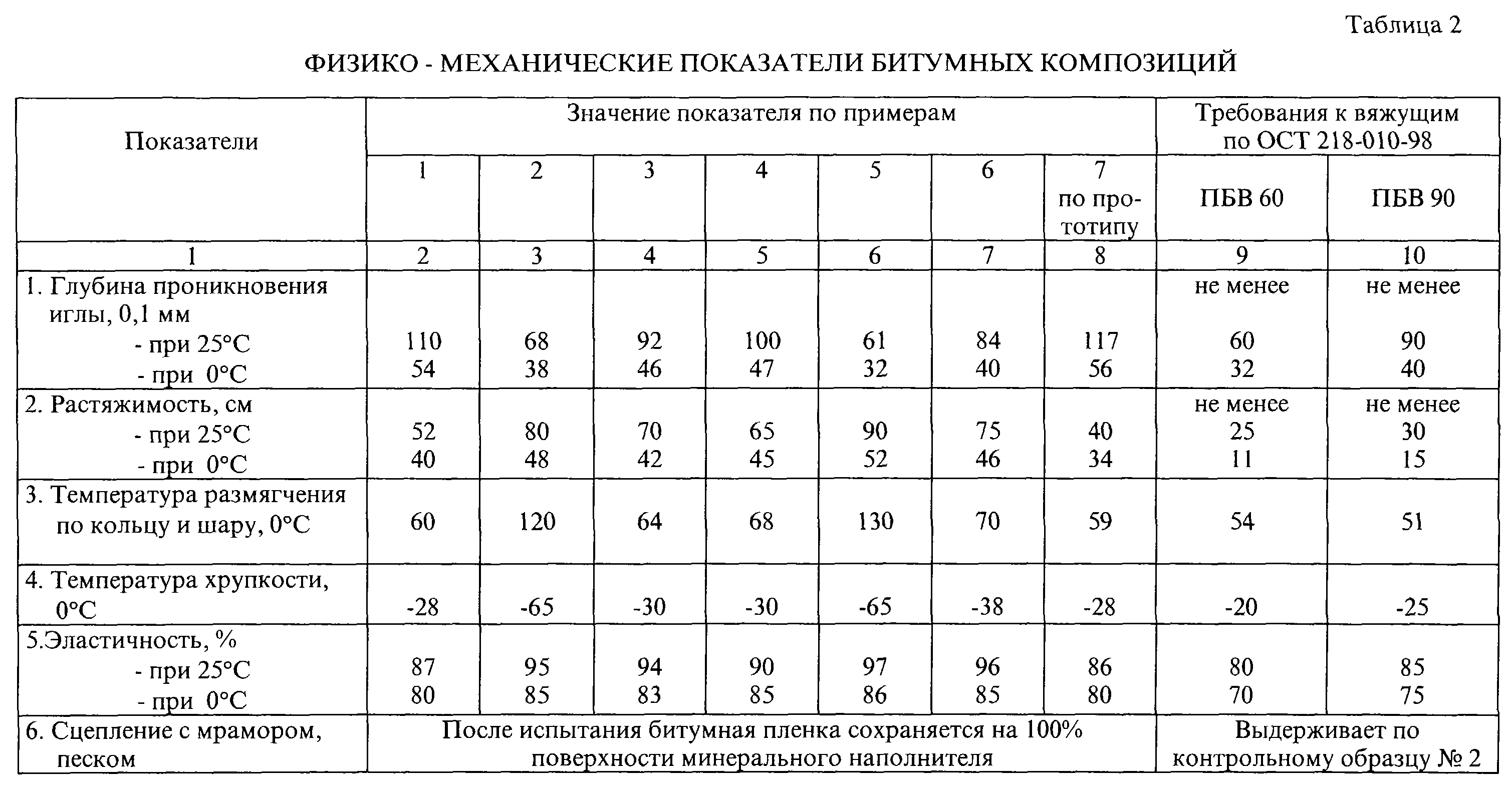 Данные по составу полимерно-битумных композиций представлены в таблице 1, по свойствам – в таблице 2.
