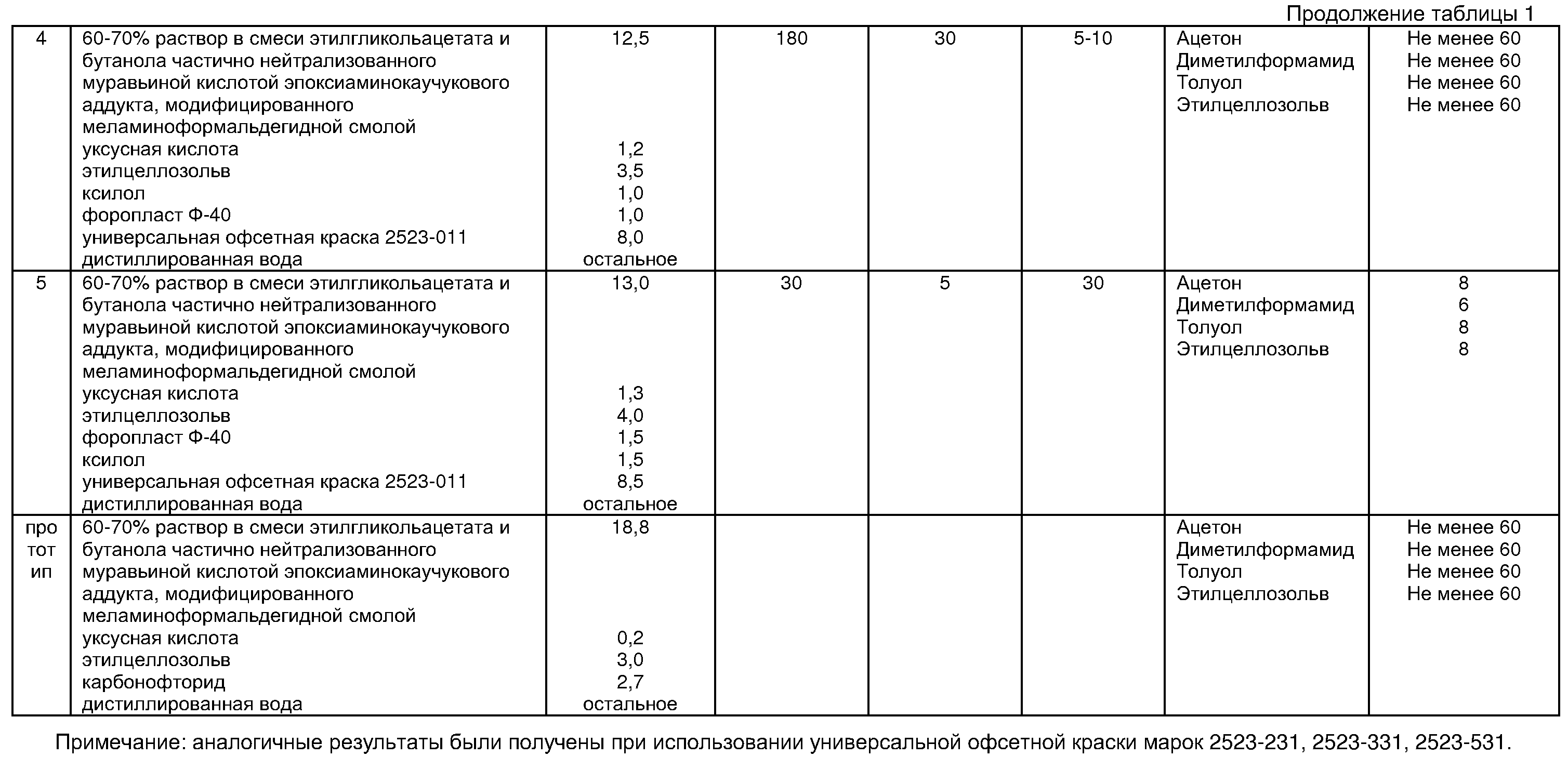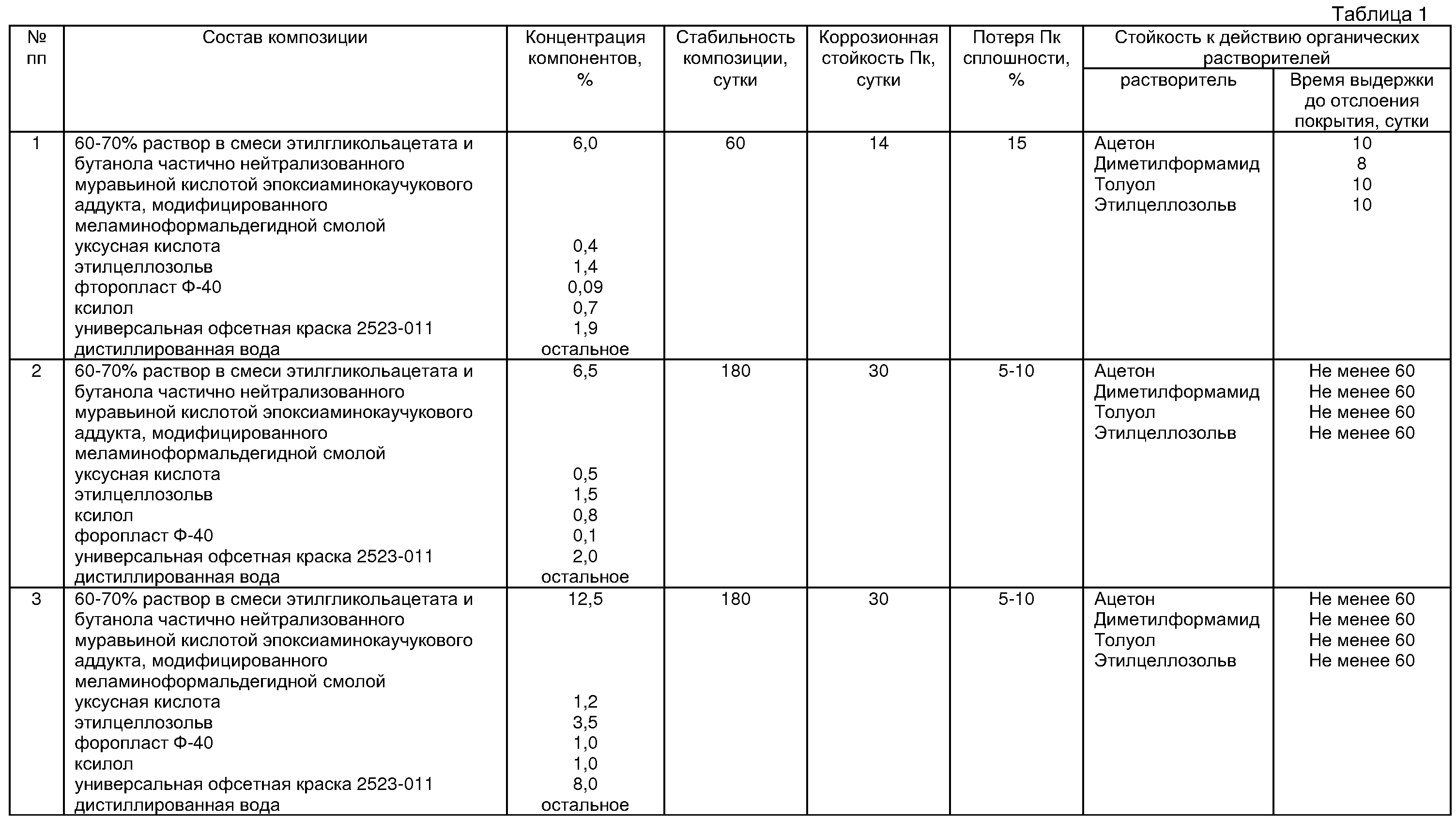 (57) Реферат: Изобретение относится к области водоразбавляемых лакокрасочных покрытий, получаемых электроосаждением на катоде, и может быть использовано для получения декоративных покрытий с высокими эксплуатационными свойствами. Композиция включает 60-70%-ный раствор в смеси этилгликольацетата и бутанола частично нейтрализованного муравьиной кислотой эпоксиаминокаучукового аддукта, модифицированного меламиноформальдегидной смолой, уксусную кислоту, этилцеллозольв, универсальную офсетную краску, ксилол, фторопласт Ф-40 и дистиллированную воду. Технический результат – создание композиции с высокой стабильностью рабочего раствора при сохранении высоких эксплуатационных свойств покрытий на ее основе. 1 табл. Изобретение относится к области водоразбавляемых лакокрасочных покрытий, получаемых методом электроосаждения на катоде, и может быть использовано для получения декоративных покрытий с высокими защитными свойствами. Известна эмаль ВМА-5194 [ТУ 6-10-1903-83], включающая сополимер малеинизированного льняного масла со стиролом, фторопласт, сажу и воду. Композиция наносится электроосаждением на аноде. Известна также грунт-эмаль ВЭП-0190 [ТУ 6-10-11-525-7-85], представляющая собой дисперсию пигментов в растворе нейтрализованной катионоактивной смолы ВЭК-М. Композиция наносится электроосаждением на катоде. Покрытия, получаемые на основе данных композиций обладают недостаточно высокими защитными свойствами, а стабильность рабочих растворов водоразбавляемых композиций составляет для эмали ВМА-5194 – 5 суток, а для грунт-эмали ВЭП-0190 – 14 суток. Недостаточно высокая стабильность растворов не обеспечивает воспроизводимость необходимых защитных свойств покрытий. Наиболее близкой к изобретению по технической сущности является композиция, содержащая 60-70%-ный раствор в смеси этилгликольацетата и бутанола частично нейтрализованного муравьиной кислотой эпоксиаминокаучукового аддукта, модифицированного меламиноформальдегидной смолой, уксусную кислоту, карбонофторид, этилцеллозольв и воду [патент РФ № 1764307 кл. С 09 D 5/44]. Однако стабильность рабочего раствора этой композиции составляет не более 30-60 суток, после чего рабочий раствор композиции расслаивается, и получить покрытия с необходимыми защитными свойствами не представляется возможным. Приготовление новых растворов, особенно в больших объемах, требует значительных затрат, так как стоимость компонентов, особенно эпоксиаминокаучукового аддукта (порядка 500 руб. за 1 кг) и карбонофторида (порядка 1500 руб. за 1 кг) достаточно велика. Задачей настоящего изобретения явилось создание композиции с более высокой стабильностью рабочего раствора при сохранении высоких эксплуатационных свойств покрытий, получаемых на ее основе. Это достигается тем, что в известную композицию, содержащую 60-70%-ный раствор в смеси этилгликольацетата и бутанола частично нейтрализованный муравьиной кислотой эпоксиаминокаучуковый аддукт, модифицированный меламиноформальдегидной смолой, уксусную кислоту, этилцеллозольв и дистиллированную воду, дополнительно введены ксилол, фторопласт Ф-40 и универсальная офсетная краска при следующем соотношении компонентов, маc.%: 60-70%-ный Раствор в смеси этилгликольацетата и бутанола частично нейтрализованного муравьиной кислотой эпоксиаминокаучукового аддукта, мо