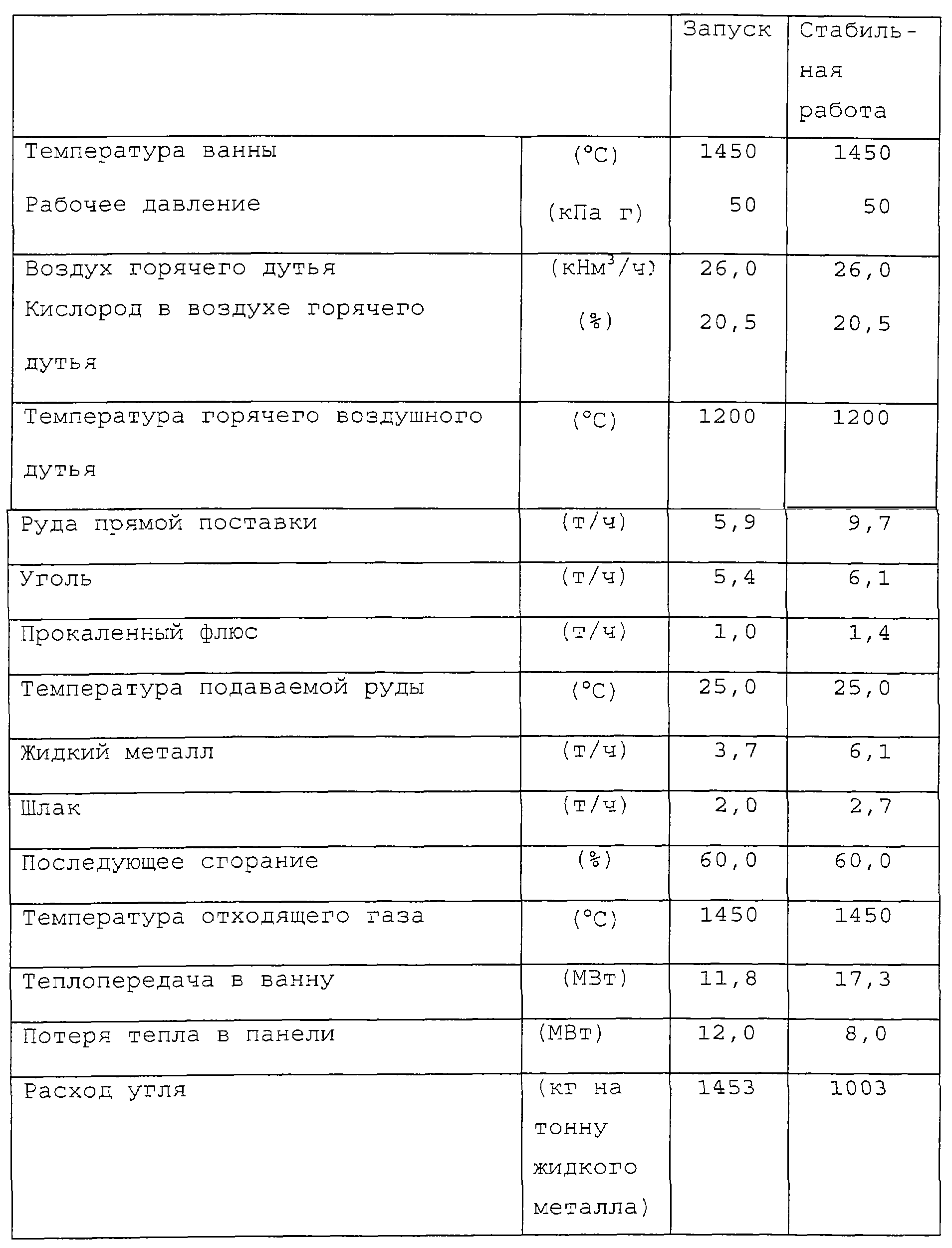 В условиях запуска опытный завод работал при соблюдении следующих параметров: расход горячего воздуха при дутье 26,000 Нм3/ч при 1200 С, уровень последующего сгорания 60% ((СO2+Н2О)/(СО+Н2+СО2+Н2О)); скорость подачи мелких фракций железной руды 5,9 т/ч, скорость подачи угля 5,4 т/ч и скорость подачи флюса 1,0 т/ч, при этом все вводилось в виде твердых материалов с использованием N2 в качестве газа-носителя. Шлак в емкости отсутствовал или его было немного, и не было достаточной возможности образования слоя застывшего шлака на боковых панелях. Как следствие, потеря тепла через охлаждающую воду была относительно высокой и составляла 12 МВт. Опытный завод работал с производительностью 3,7 т/ч жидкого металла (4,5 вес.% С) и расходом угля 1450 кг на тонну произведенного жидкого металла.