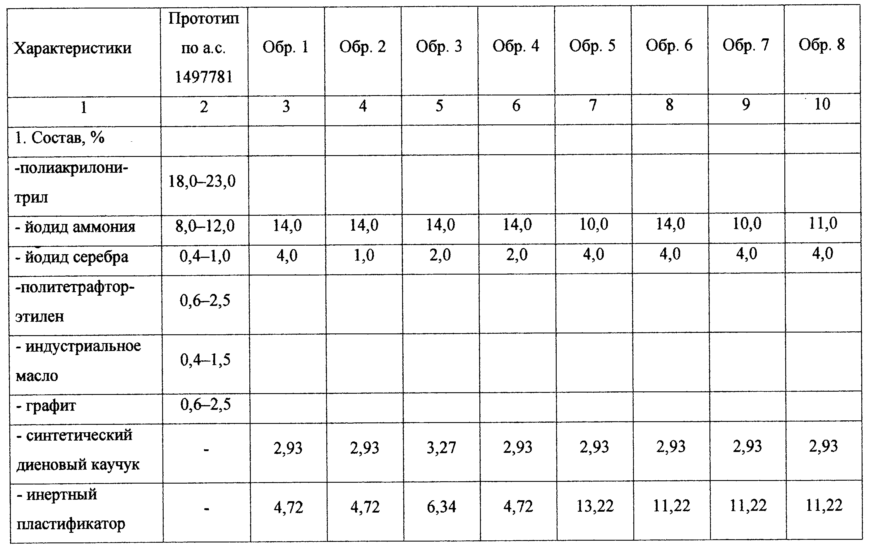 В таблице приведены рецептуры составов испытанных льдообразующих топлив и их характеристики: