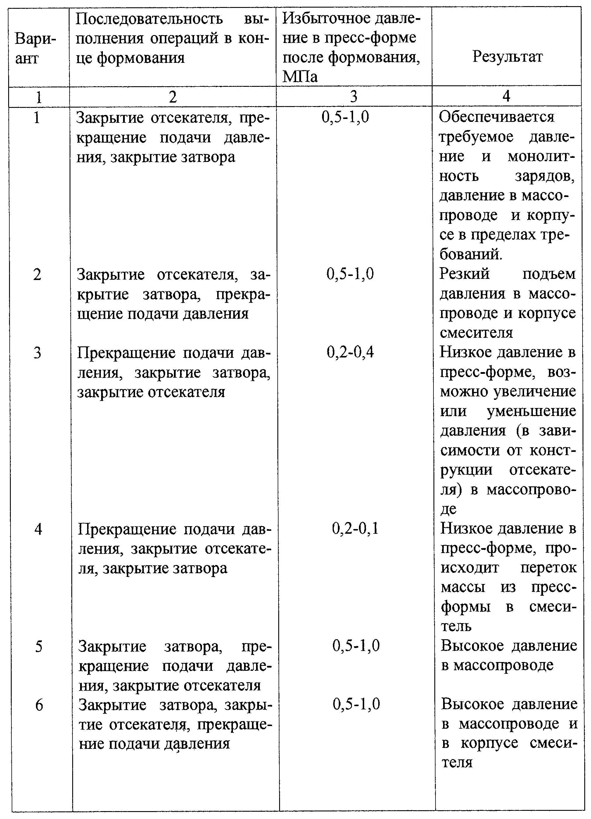 Из данных таблицы видно, что выполнение операций в предлагаемой авторами последовательности (вариант 1) обеспечивает требуемое избыточное давление в пресс-форме в конце формования (0,5-1,0 МПа) и монолитность заряда за счет его сохранения на последующих фазах технологического процесса (с момента отсечки до установки заряда на полимеризацию). Выполнение операций в конце формования в любой другой последовательности приводит или к потере давления в пресс-форме (варианты 3, 4), или к превышению давления выше допустимых в массопроводе и корпусе смесителя (варианты 2, 5, 6), что может привести к выходу из строя гидравлической системы вытеснения и разрушению массопровода.