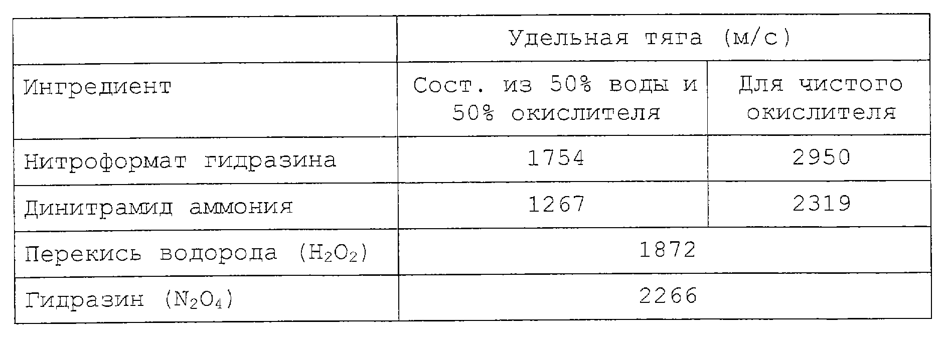 На прилагаемой фигуре показаны значения удельной тяги для разных составов из нитроформата гидразина и воды с использованием разных концентраций, динитрамида аммония и воды с использованием разных концентраций и для комбинации нитроформата гидразина, этанола и воды.