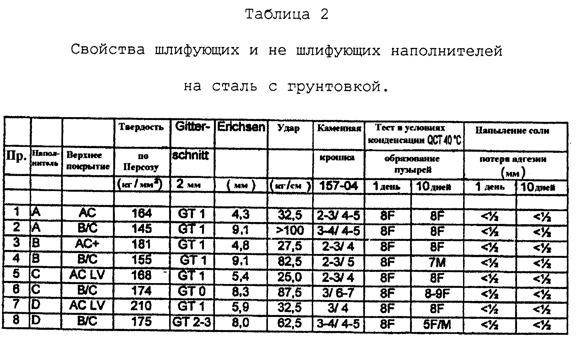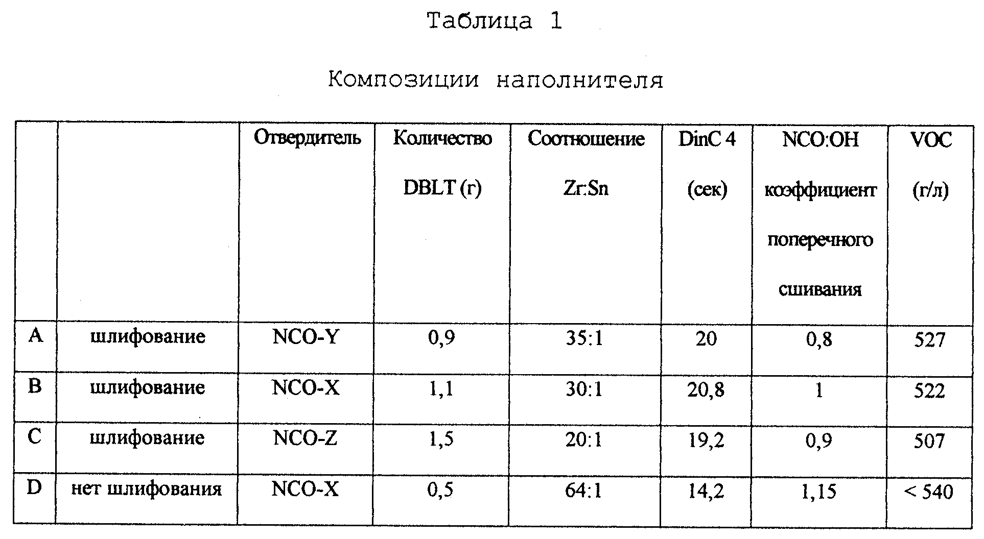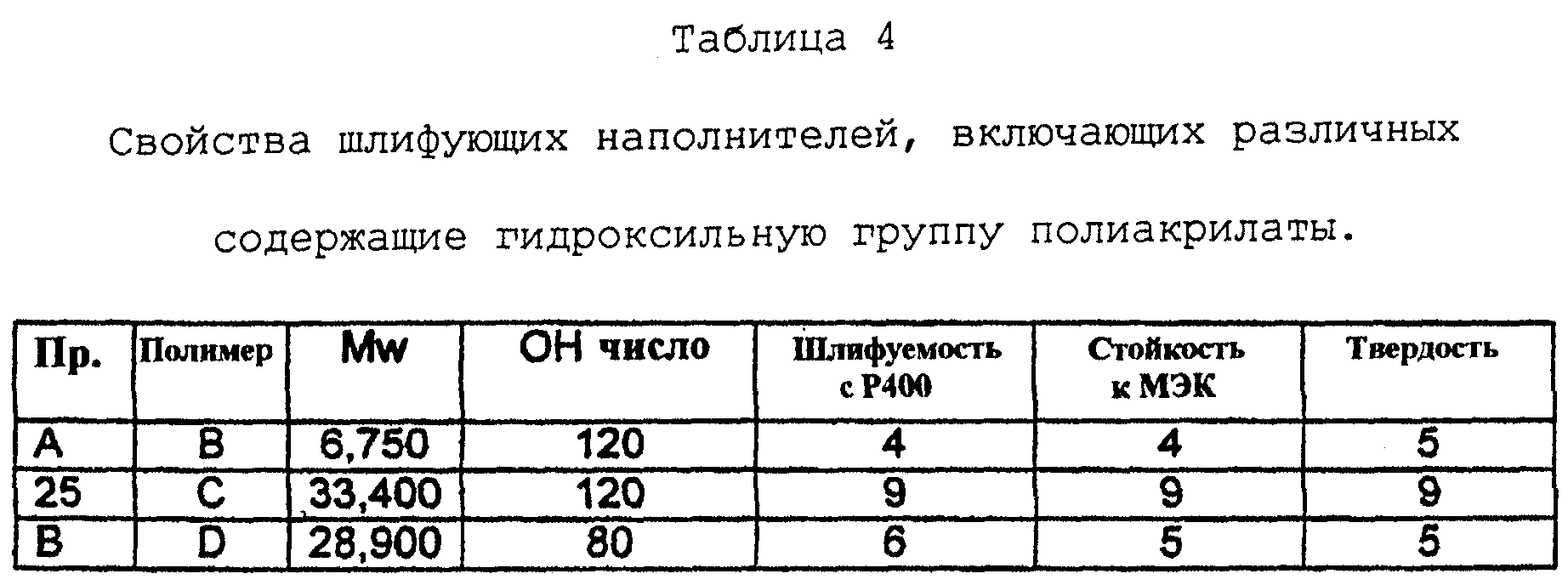 Добавляют NCO-X для получения соотношения NCO:OH, равного 1. Данную композицию наполнителя наносят на стальную пластину. Свойства шлифуемости и стойкость к МЭК определяют через 3 часа сушки при температуре окружающей среды. Эксперимент повторяют за исключением замены содержащего гидроксильную группу полиакрилата С содержащими гидроксильную группу полиакрилатами В или D при содержании твердых тел 51 мас.% Результаты эксперимента показаны в таблице 4.