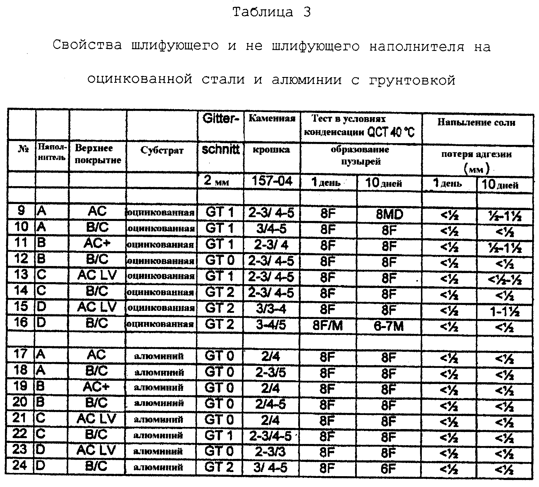 На субстраты с грунтовочным покрытием напыляют шлифующие наполнители и сушат в течение 1 дня при комнатной температуре. Затем субстраты с покрытием шлифуют Р500 и наносят другие верхние покрытия. Толщина высушенного слоя наполнителя составляет от 70 до 100 мкм.