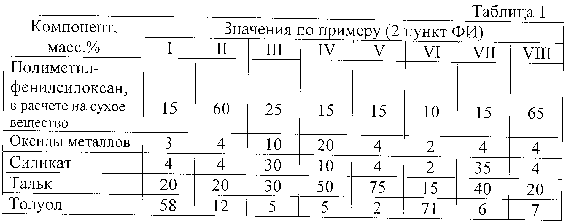 В шаровую мельницу объемом 5 м3 (возможно использование мельницы объемом от 1,63 до 8 м3) загружали уралитовые шары. После этого в мельницу загружали все сухие компоненты композиции, а затем полиметилфенилсилоксан и толуол; соотношение компонентов выбиралось в зависимости от примера. В течение 24 часов при помощи уралитовых шаров производили перетирку компонентов, в результате которой компоненты смешивались, между ними происходила механохимическая реакция. В результате получили композицию в виде суспензии. Композицию расфасовывали в тару и направляли потребителям.