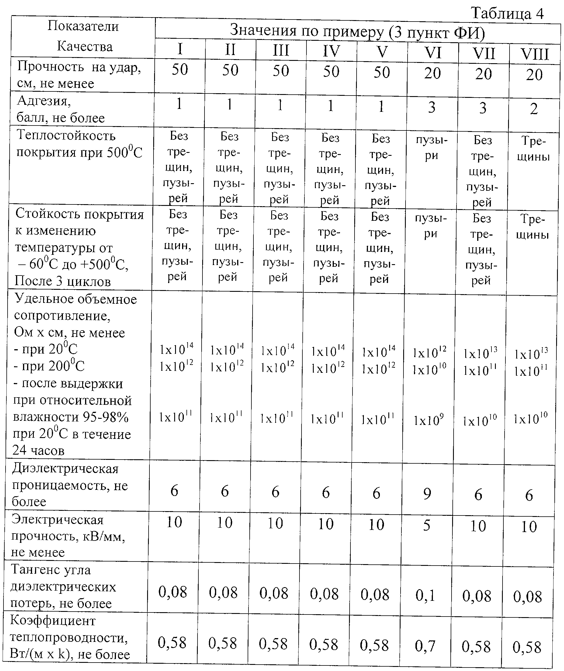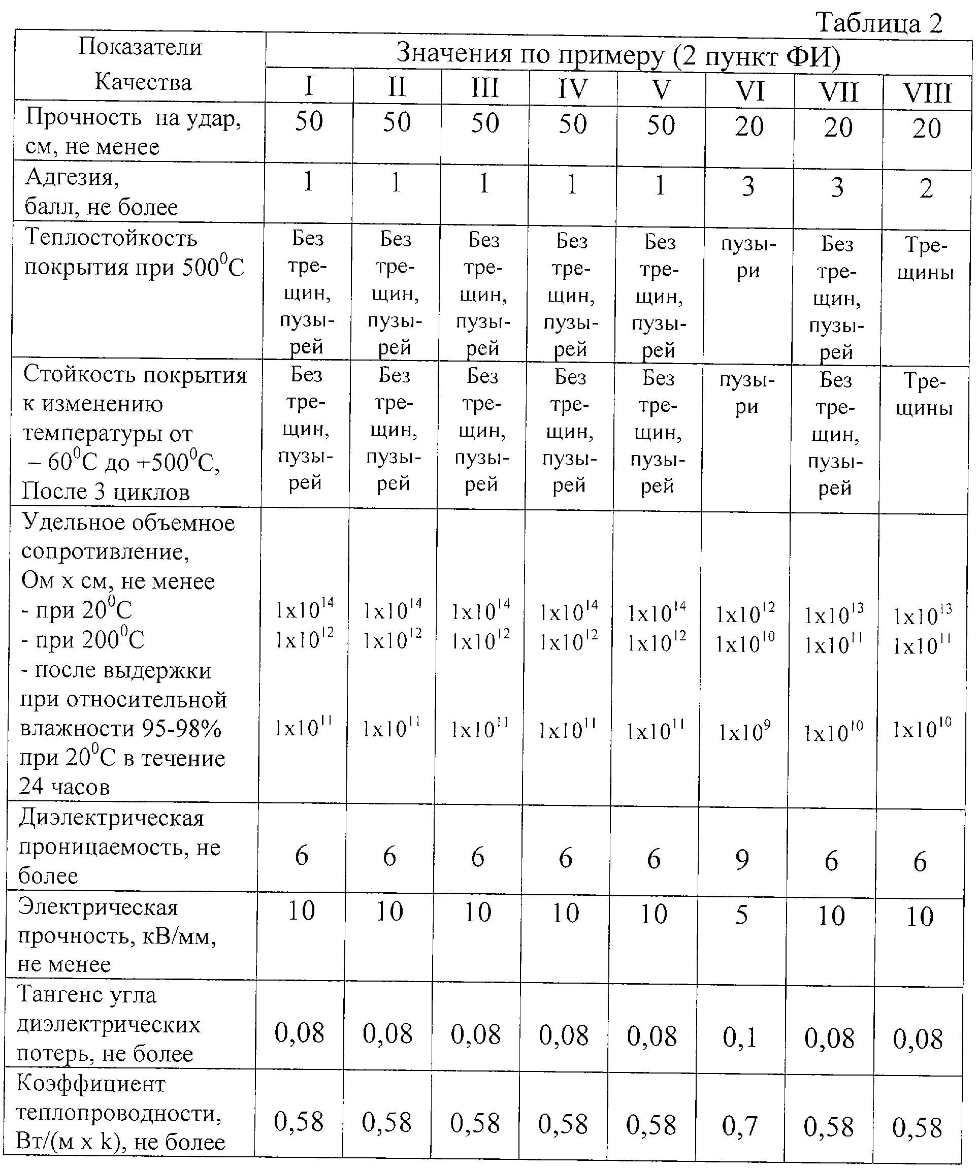 В композиции по второму пункту формулы изобретения высокая термостойкость и электроизоляционные свойства покрытия обусловлены благодаря использованию смеси силиката и талька в следующих количествах: силикат 4-30 мас.% и тальк 20-75 мас.%. При введении силиката и талька в меньших количествах ухудшаются защитные и электроизоляционные свойства покрытия при воздействии высоких температур, уменьшается электрическая прочность и теплопроводность покрытия; а при введении их в больших количествах композиция становится непластичной, плохо растекается по поверхности, ухудшается адгезия покрытия к подложке.