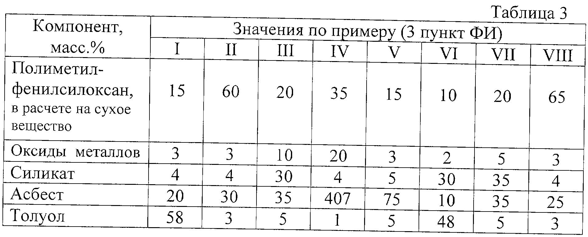 – в таблице 3 представлены количественные значения содержания компонентов композиции по примерам по третьему пункту формулы изобретения;