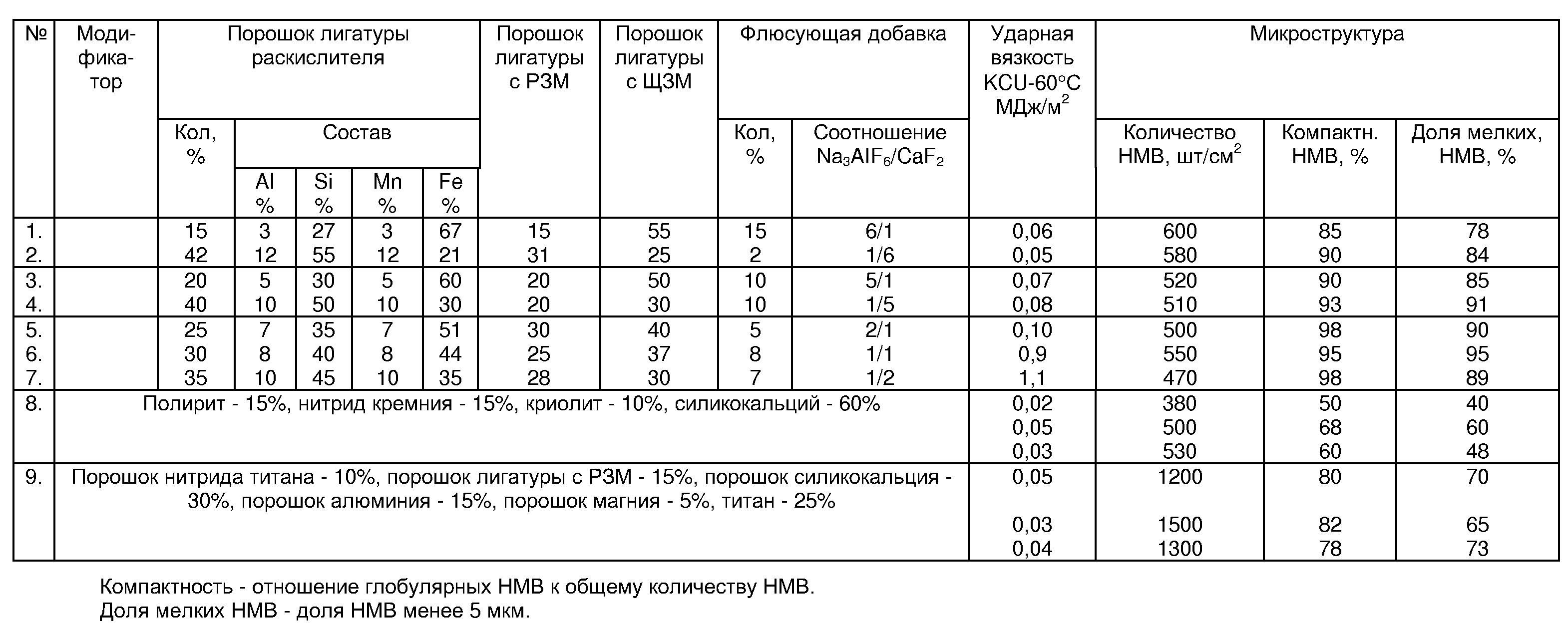 Результаты испытаний трех образцов при -60 С и металлографического изучения количества и формы НМВ (см. таблицу) с использованием известных и предлагаемого составов модификаторов показали, что техническое решение изобретения достигнуто.