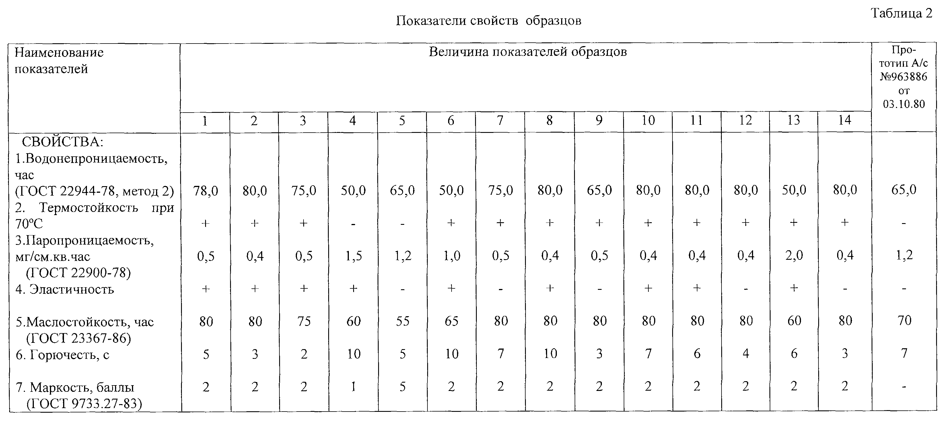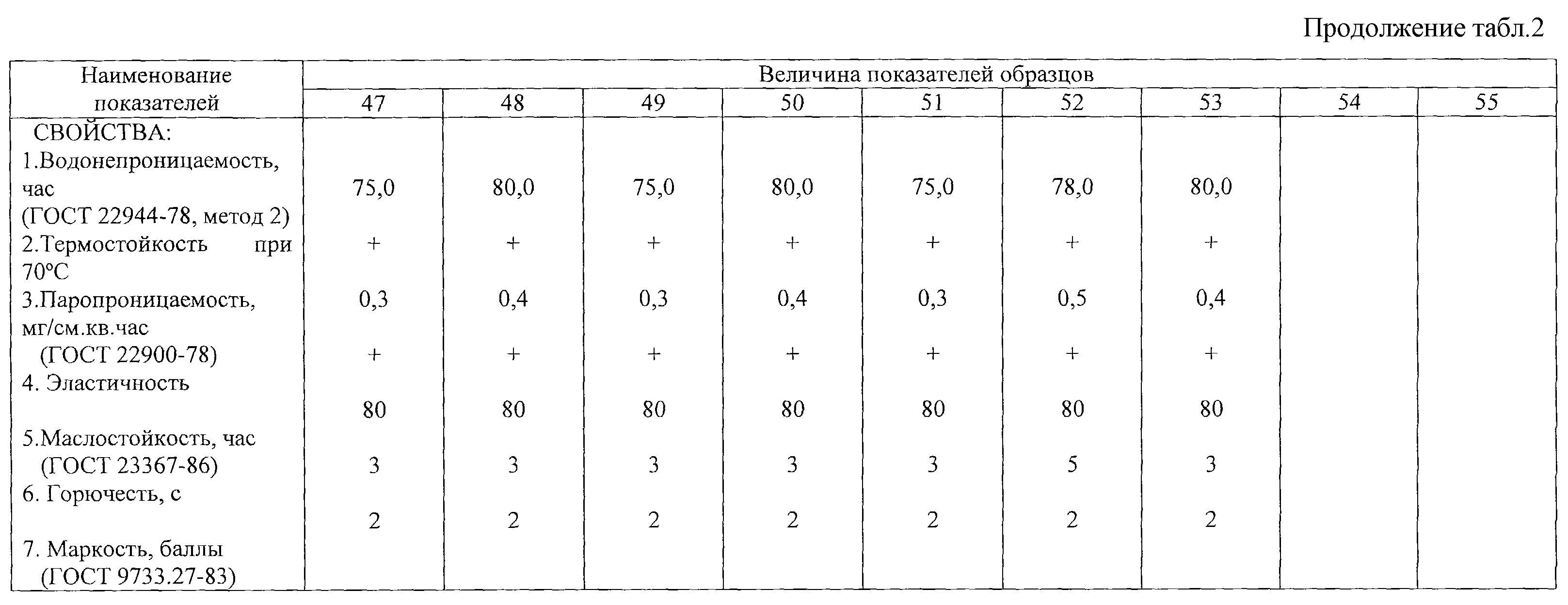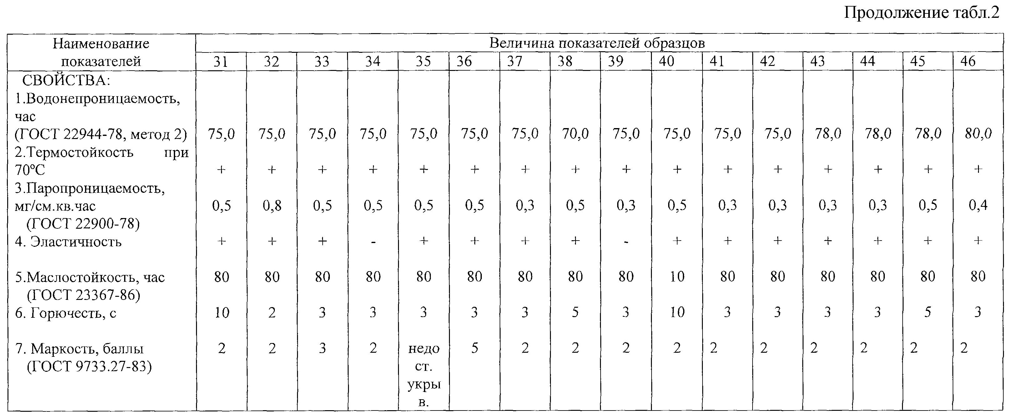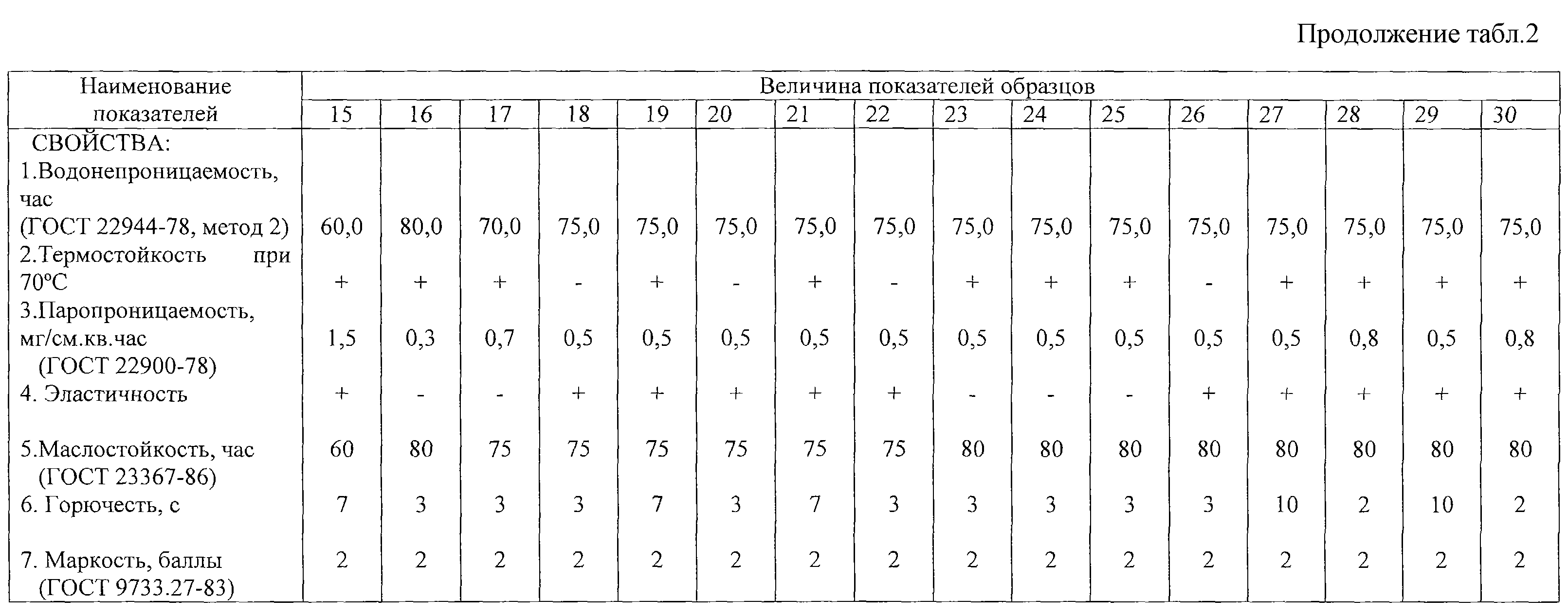То же, что в примере 1, свойства материала представлены при среднем значении всех заявленных признаков. Однако количество вводимого пластификатора хлорпафина в первом случае менее 5, во втором более 30 мас.ч.