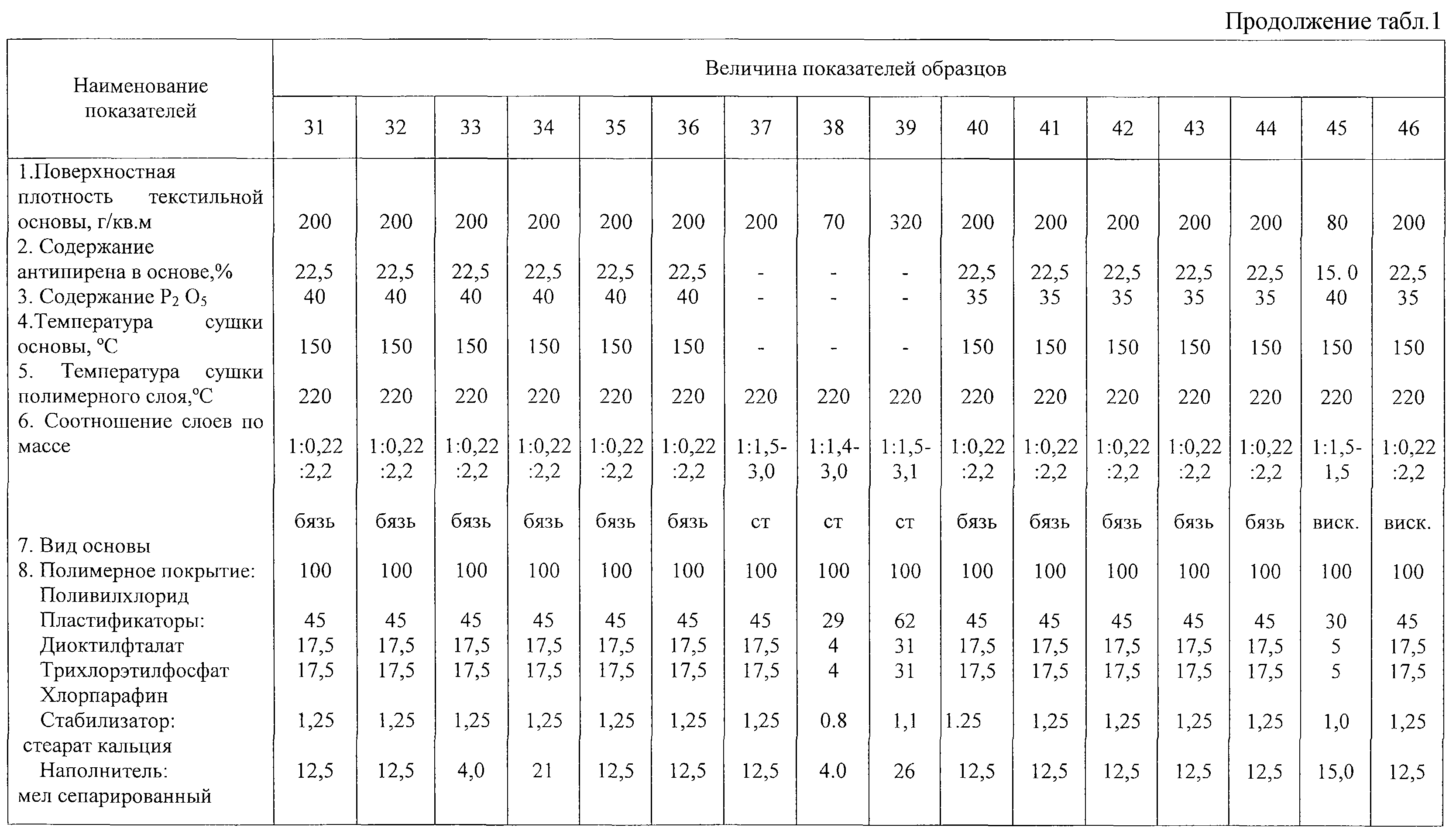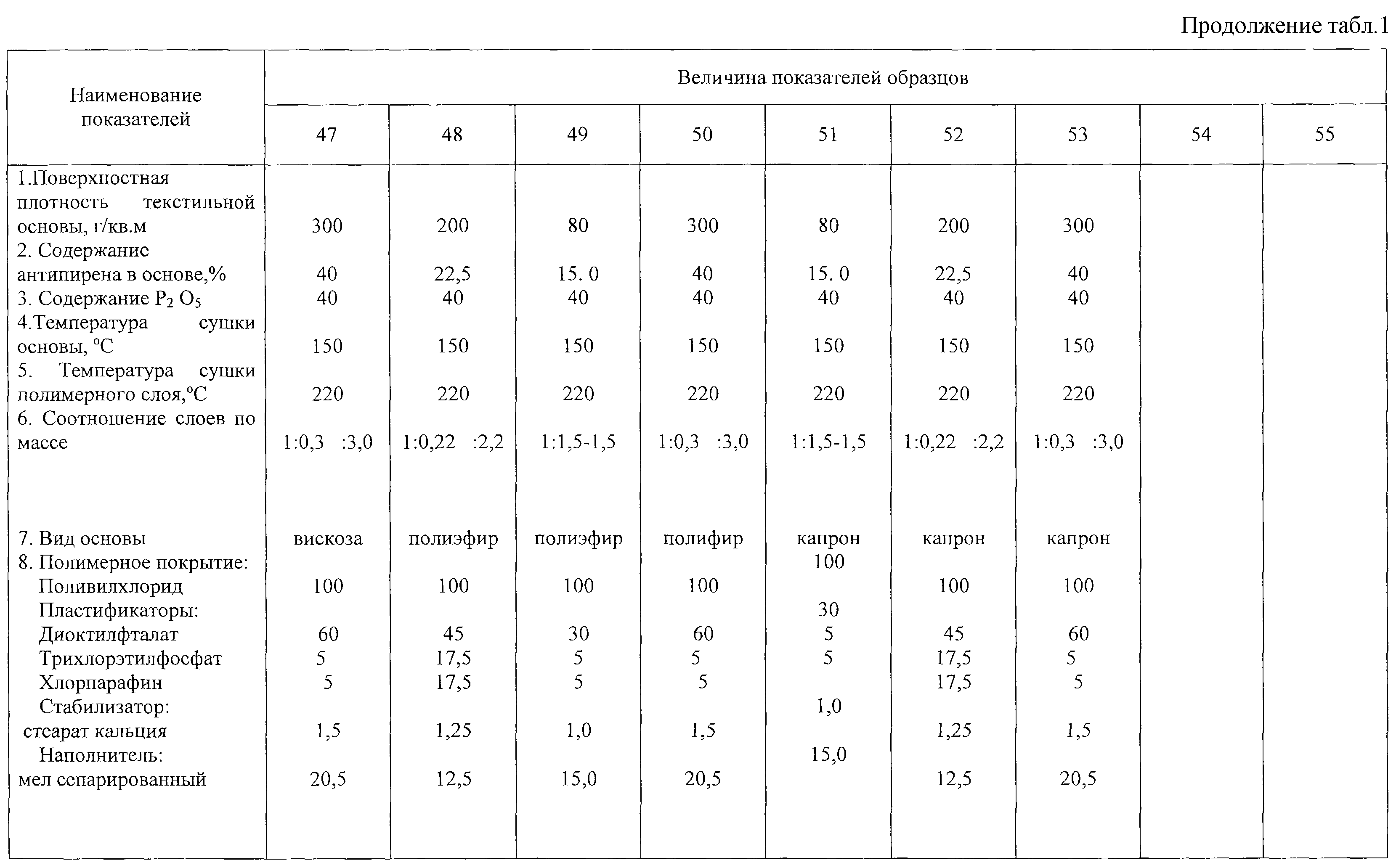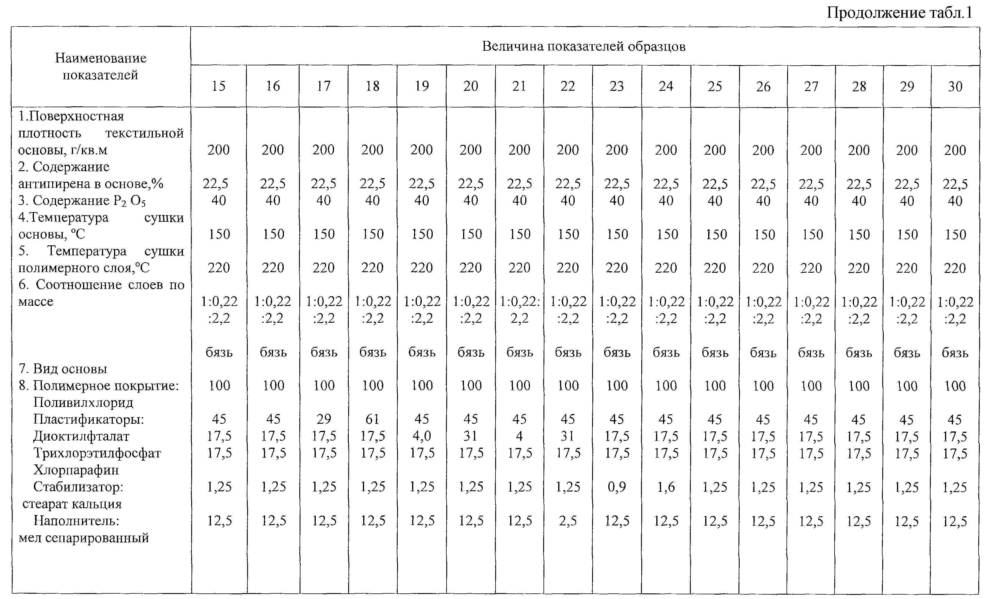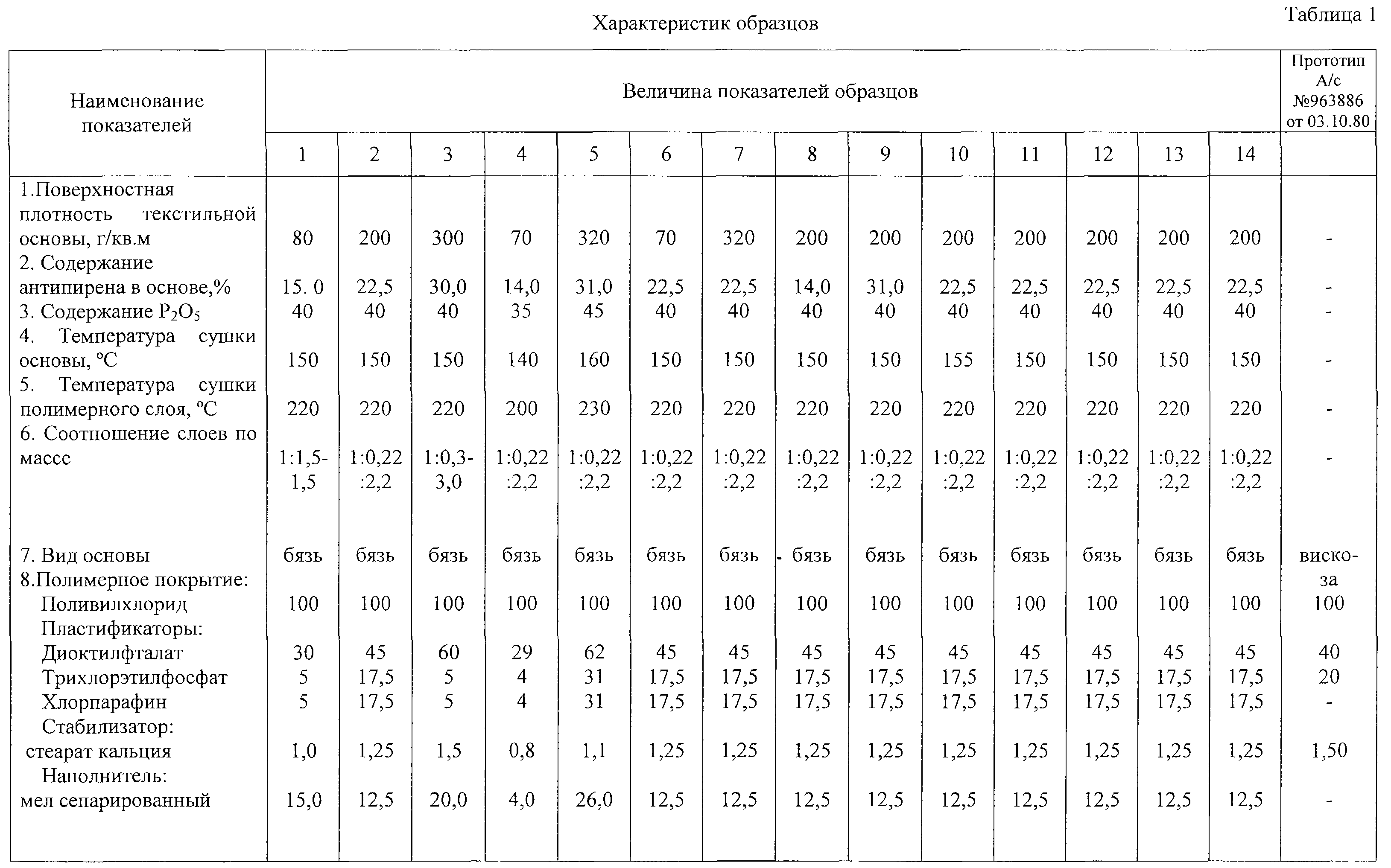 Текстильная основа поверхностной плотности 80 г/кв.м, в данном случае бязь, подвергается обработке раствором антипирена с содержанием Р2О5 не менее 40%. Пропитка текстильной основы осуществляют в пропиточной ванне, снабженной отжимными валами, процесс производится до содержания антипирена в пропитанной основе не менее 15%. Затем осуществляют сушку пропитанного материала при температуре 150 С. На пропитанную основу наносным методом в 2 слоя с лицевой стороны наносится полимерное покрытие, содержащее следующие компоненты: