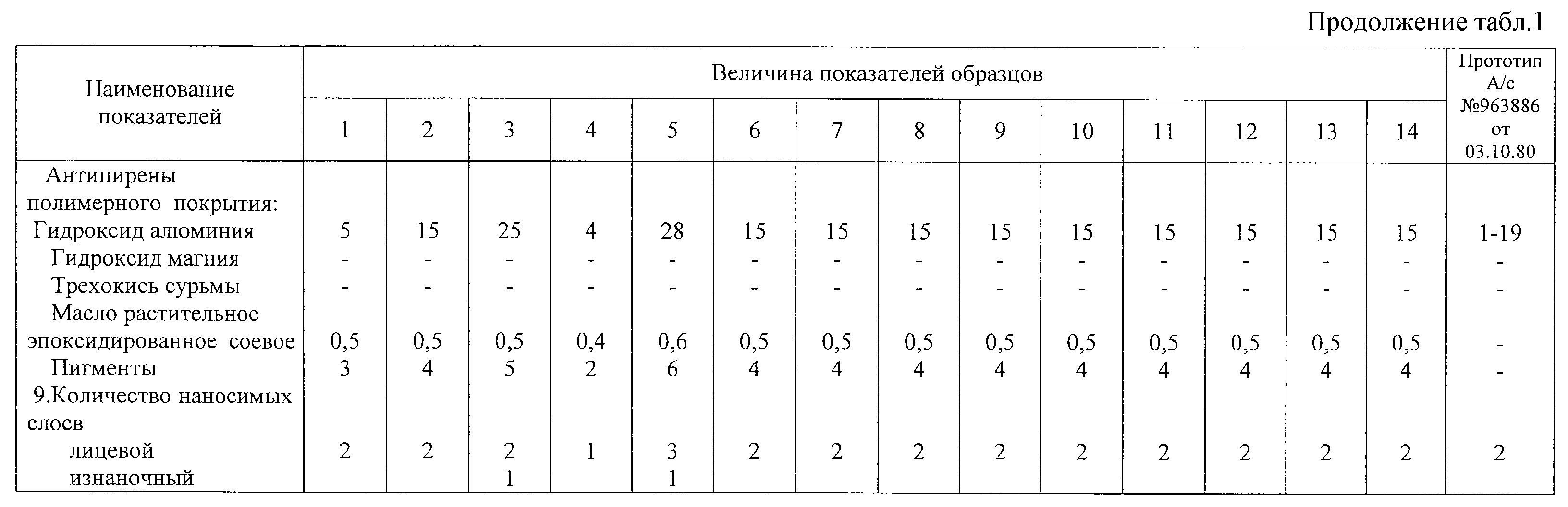 Полимерное покрытие для нанесения на пропитанную основу готовят следующим образом: в роторный смеситель вводится поливилхлоридная смола в виде порошка или в виде пасты (антипирен: пластификатор в соотношении 1:1, затертые на краскотерке), далее вводятся оставшееся расчетное количество пластификаторов, затем эпоксидированное соевое масло, далее загружается в смеситель паста стабилизаторов и мела (перетирание на краскотерке стабилизатора и пластификатора в соотношении 1:1), затем в смеситель вводится паста пигментов. Все компоненты смеси вводятся в смеситель при перемешивании. После ввода всех компонентов производится перемешивание смеси в течение 40-50 минут при температуре 36-40 С (за счет саморазогрева при перемешивании). После этого приготовленная масса для улучшения однородности пропускается через краскотерку и подается для нанесения покрытия.