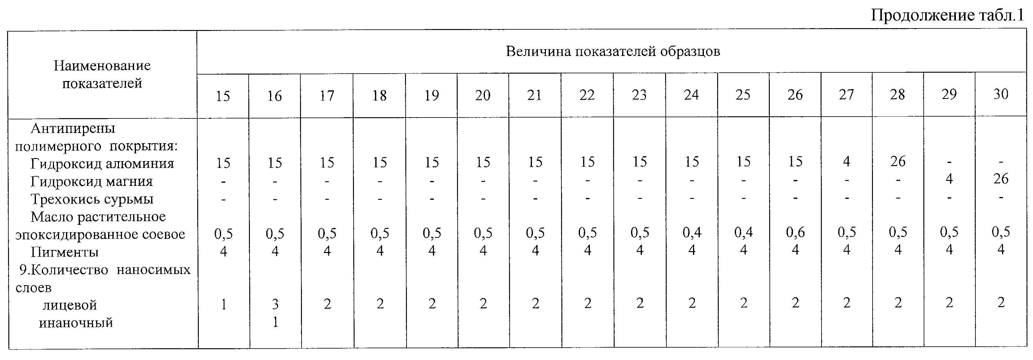 Формула изобретения Многослойный облицовочный термостойкий материал типа искусственной кожи, включающий текстильную основу из натуральных и химических волокон или их смеси поверхностной плотностью 80-300г/м2, полученный пропиткой основы до содержания 15-30% от ее массы водным раствором солей фосфата аммония с содержанием 2О5 не менее 40% с последующей сушкой при температуре не более 150 С, и полимерное покрытие, сформированное на упомянутой основе после ее сушки при температуре не более 150 С наносным методом в 2-3 слоя с лицевой и изнаночной сторон или только с лицевой стороны пропитанной основы и термообработанное после нанесения каждого из слоев при температуре не более 220 С и содержащее следующие компоненты, мас.ч.: