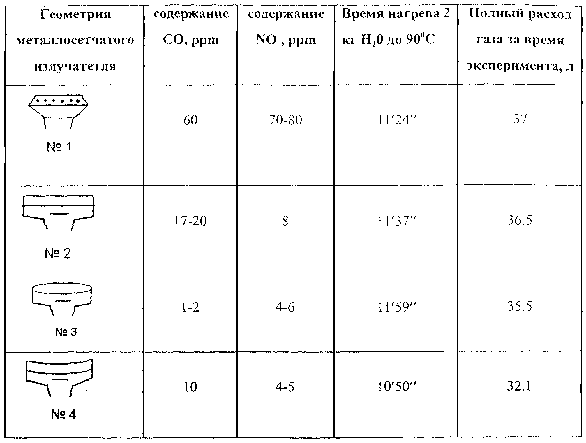 С и определялся состав продуктов сгорания. Контролировался мгновенный расход газа, суммарный расход газа за время эксперимента, для воды использовалась одна и та же емкость. Состав продуктов сгорания определялся газоанализатором TESTO-350. В таблице 1 приведены результаты сравнительных экспериментов.