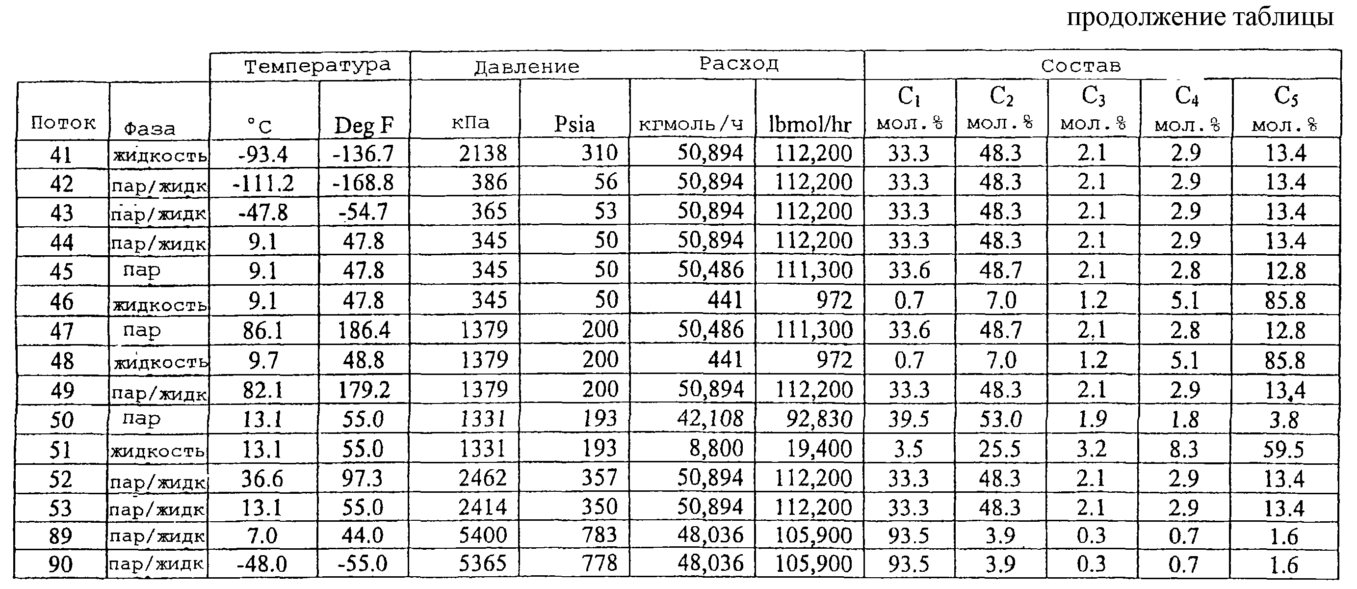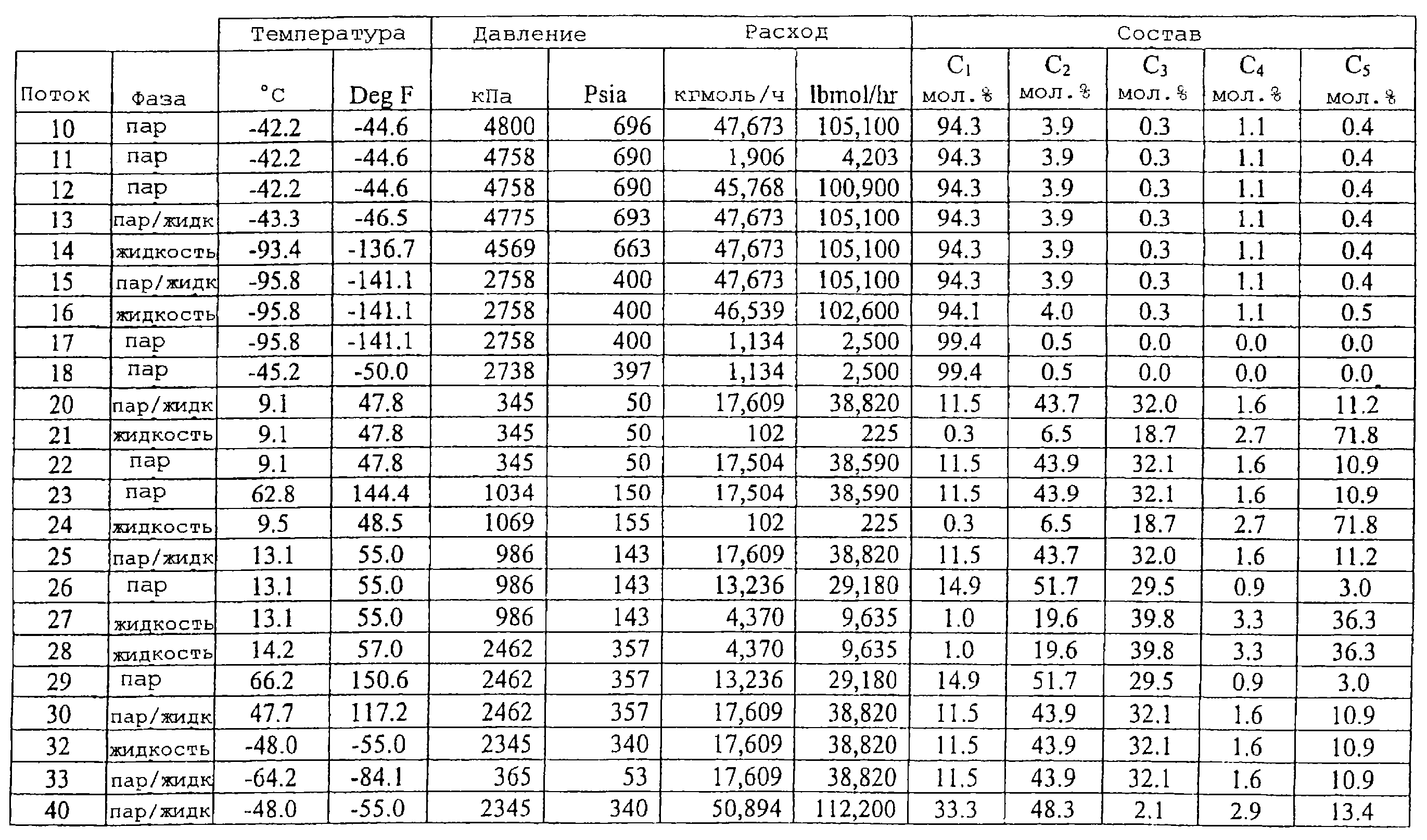 Моделированный баланс массы и энергии был составлен для того, чтобы проиллюстрировать конструктивное исполнение, показанное на чертеже, и результаты показаны в таблице, приведенной ниже. Данные были получены с использованием применяемой в промышленности программы моделирования процесса, называемой HYSYSTM (предоставляемой Hypotech Ltd, Калгари, Канада); однако, другие применяемые в промышленности программы моделирования процесса могут быть использованы для создания данных, включая, например, HYSIMTM, PROIITM и ASPEN PLUSTM, которые хорошо известны специалистам в этой области техники. Данные, приведенные в таблице, представлены для того, чтобы обеспечить лучшее понимание конструктивного исполнения, показанного на чертеже, но изобретение не должно быть истолковано как излишне ограниченное этим конструктивным исполнением. Величины температур и расходов не должны рассматриваться как ограничения изобретения, которое может иметь множество вариантов температур и расходов с точки зрения его изучения.