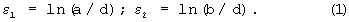 Для проверки реализации на рабочей части образца, находящейся при испытании в контакте с эластичным вкладышем, условий однородной плоской деформации после испытания определяли деформации по предварительно нанесенной на образец фотоконтактным способом делительной сетке из системы пересекающихся окружностей диаметром d=2,6 мм. С этой целью на универсальном микроскопе УИМ-22 с точностью ±0,001 мм по обе стороны от образовавшейся трещины (по нормали к ней) измеряли наибольший а и наименьший b размеры ячеек деформированной делительной сетки. Измерение начинали с ближайшей к трещине целой ячейки, соседней с ячейкой рассеченной возникшей трещиной. Главные деформации в плоскости листа рассчитывали по формулам