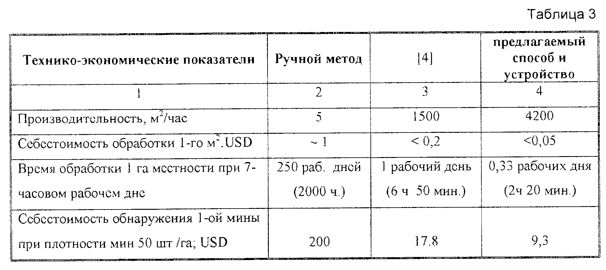 В таблице 3 представлены сравнительные технико-экономические характеристики для способов обнаружения ВВ, используемых в работах по очистке заминированных территорий при соблюдении требований ООН для гуманитарного разминирования [6].