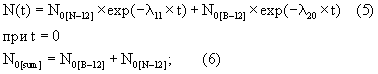 где N(t) – число нераспавшихся ядер в момент времени t; N0 – исходное число образованных ядер, – константа распада. В нашем случае распада двух элементов: