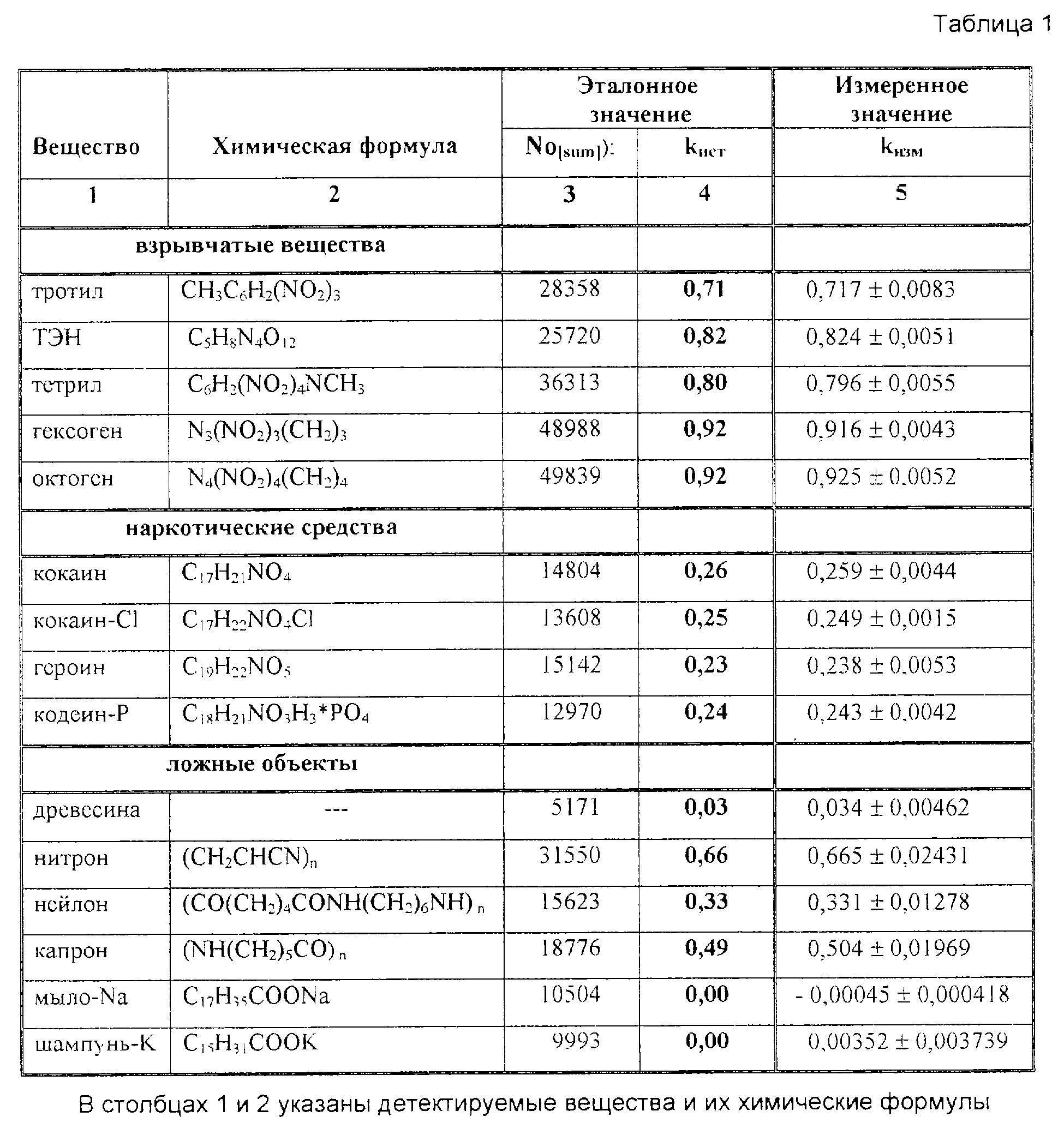 В столбце 4 приведены расчетные данные для подвижной установки, использующей заявляемые способ и устройство обнаружения и идентификации скрытых взрывчатых веществ.