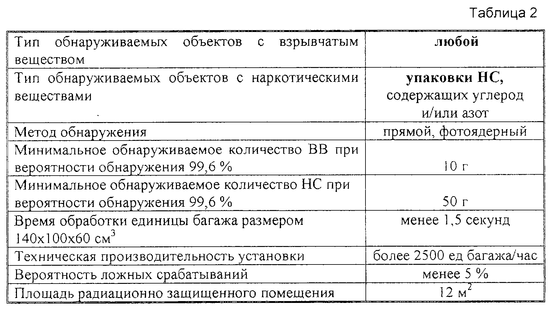 В таблице 2 представлены основные характеристики стационарной установки для контроля багажных единиц в аэропортах, которая может быть разработана на основе предлагаемого изобретения. Приведенные данные получены на основании результатов компьютерного моделирования процессов обнаружения и идентификации ВВ и НС.