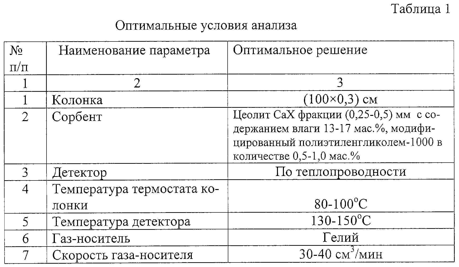 Пример 1 (по заявляемому способу). Пробу газов анализируют при условиях, приведенных в таблице 1.