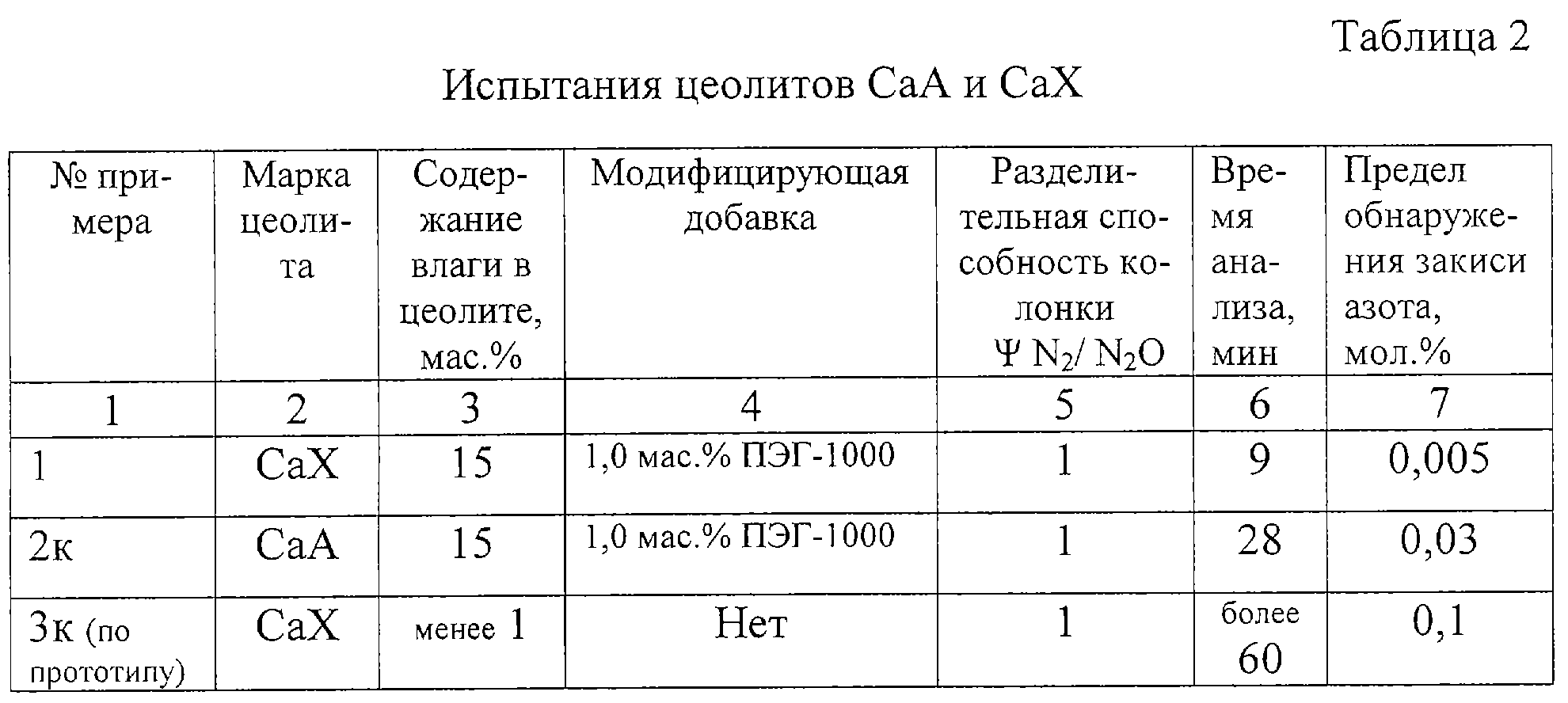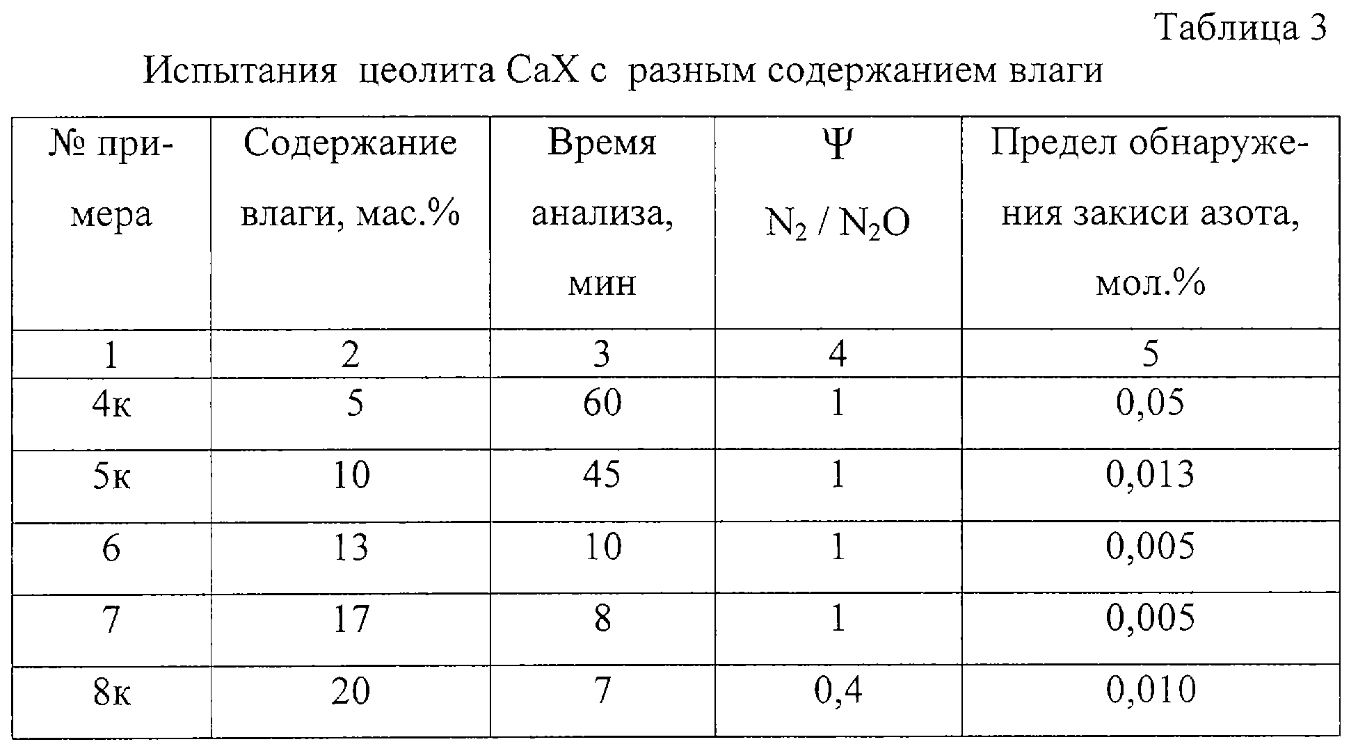 Результаты испытаний по примерам 1-8, представленные в таблицах 2 и 3, показывают, что только цеолиты СаХ с содержанием влаги 13-17 мас.% позволяют в максимальной степени решить поставленную техническую задачу и обеспечивают хорошее (см. таблицу 3, =1) разделение компонентов пробы с минимальным временем анализа и максимальной чувствительностью определения закиси азота.