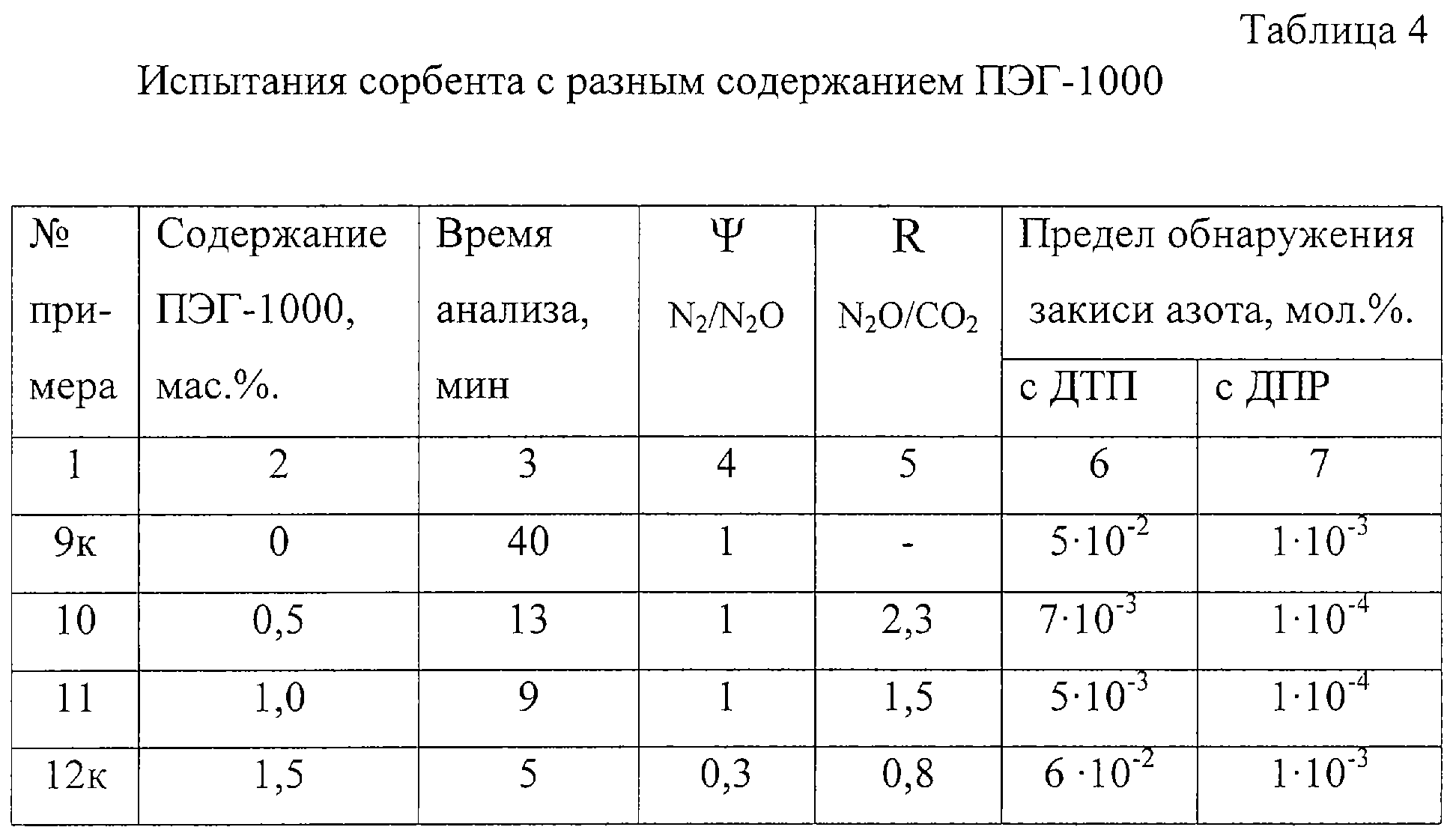 Результаты исследований, приведенные в таблице 4, показывают, что оптимальное содержание ПЭГ-1000 на цеолите СаХ с содержанием влаги 13-17 мас.% составляет 0,5-1,0% от массы цеолита. Только в этом случае достигается полное отделение закиси азота от азота и диоксида углерода и обеспечивается высокая чувствительность анализа 1