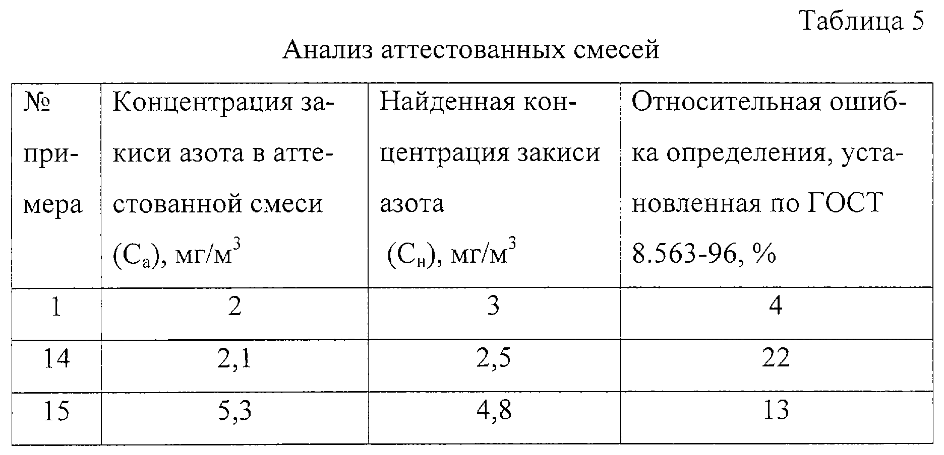 Примеры 14, 15 (по заявляемому способу). С целью установления метрологических характеристик метода проводят анализ аттестованных смесей, содержащих около 2 и 5 мг /м3 закиси азота в воздухе. Условия анализа – по таблице 1, регистрацию закиси азота осуществляют с помощью ДПР. Полученные результаты приведены в таблице 5.