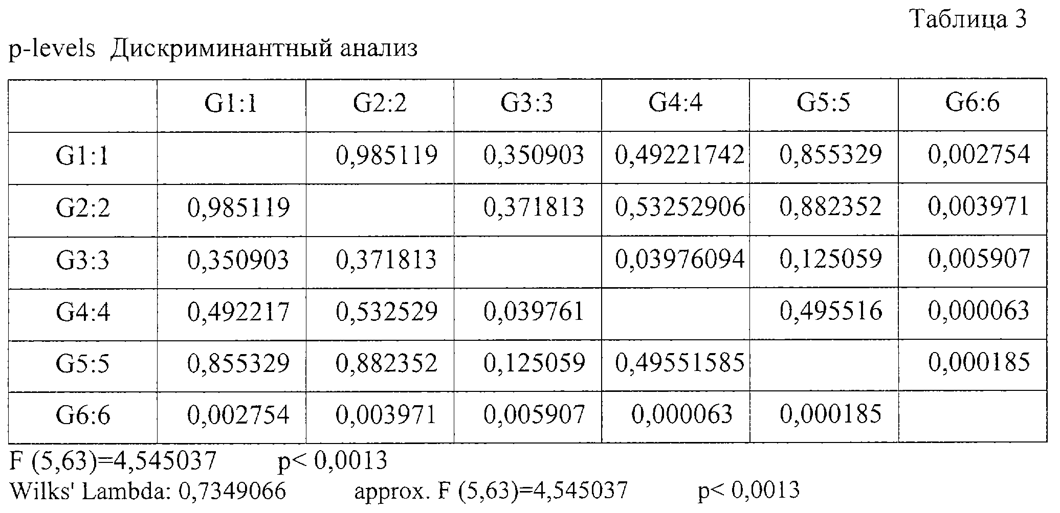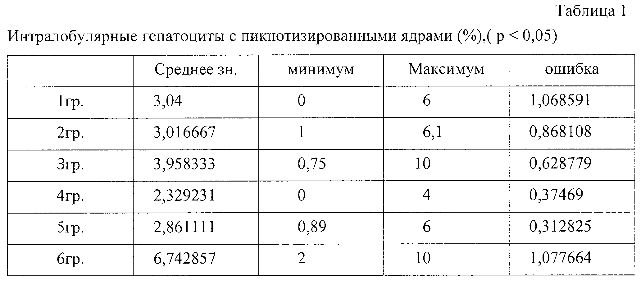 Достоверность выбранной модели превышает 99% (р<0,0013). Для определения численных значений полученного критерия, позволяющих с большой вероятностью предполагать диагноз ХВГ В+С в сочетании с описторхозом, обратимся к таблице 1. Наибольшее значение показатель имеет в 6 гр. Среднее арифметическое значение показателя в 6 гр. равно 6,74%, а ошибка среднего арифметического 1,08%. Согласно теории статистики, с вероятностью 95,5%, среднее значение величины будет находиться в пределах двойной ошибки средней арифметической, т.е. в нашем случае 6,74±2 1,08%. В итоге получаем числовое значение показателя: 6,74±2,16%. Нижняя граница признака соответствует 4,58%. Таким образом, с вероятностью 95,5% можно утверждать, что при определении по вышеописанной методике количества интралобулярных гепатоцитов с пикнотизированными ядрами более 4,58%, диагностируемое состояние является сочетанием ХВГ В+С в фазе репликации и хронического описторхоза.