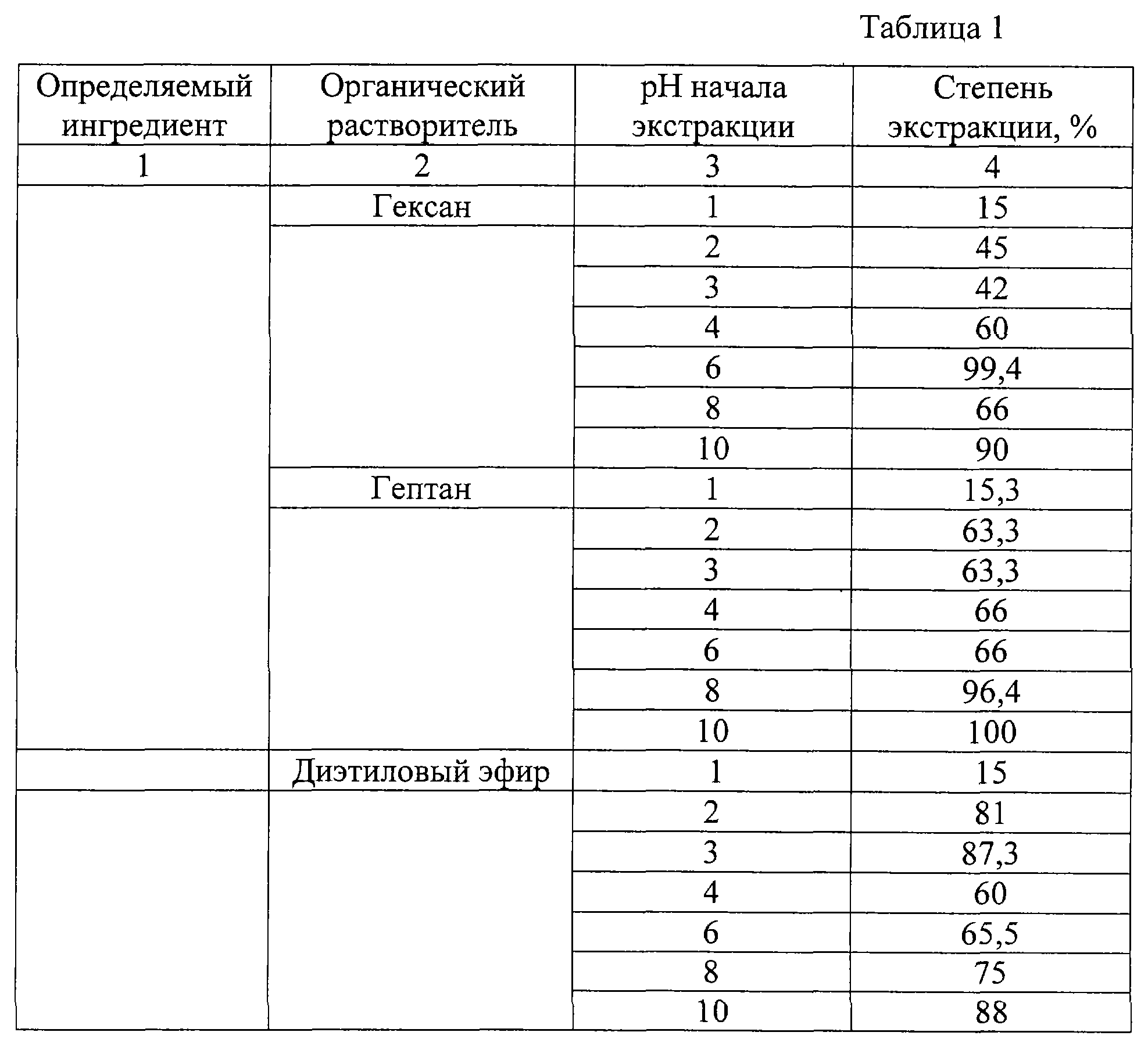 В ходе испытаний была изучена зависимость степени экстракции хлорбензола из пробы мочи от рН среды и природы органических растворителей. Результаты приведены в табл.1.