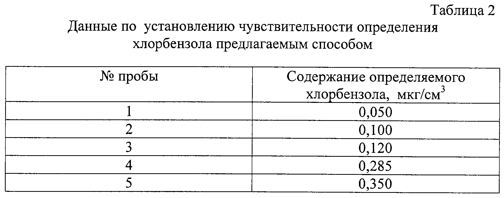 В ходе лабораторных испытаний также устанавливали чувствительность определения хлорбензола в моче предлагаемым способом. Полученные результаты приведены в табл.2.